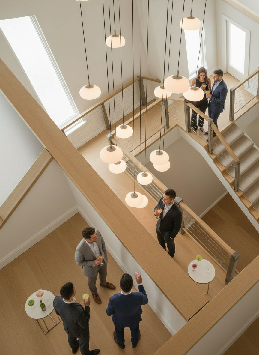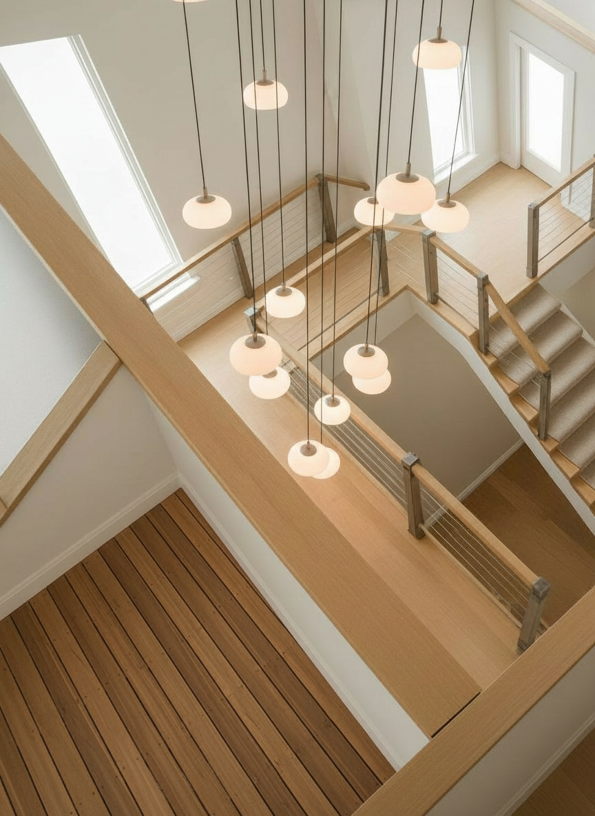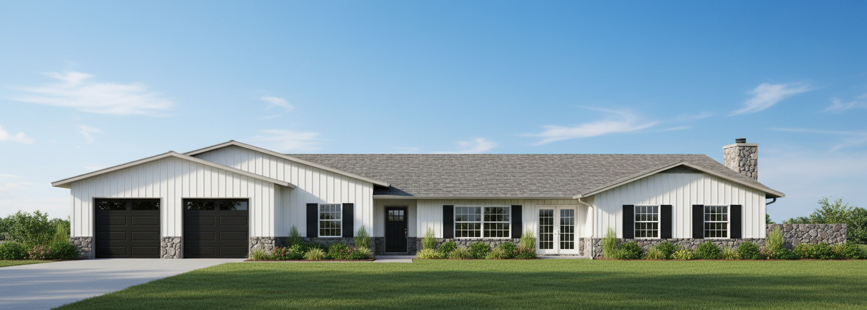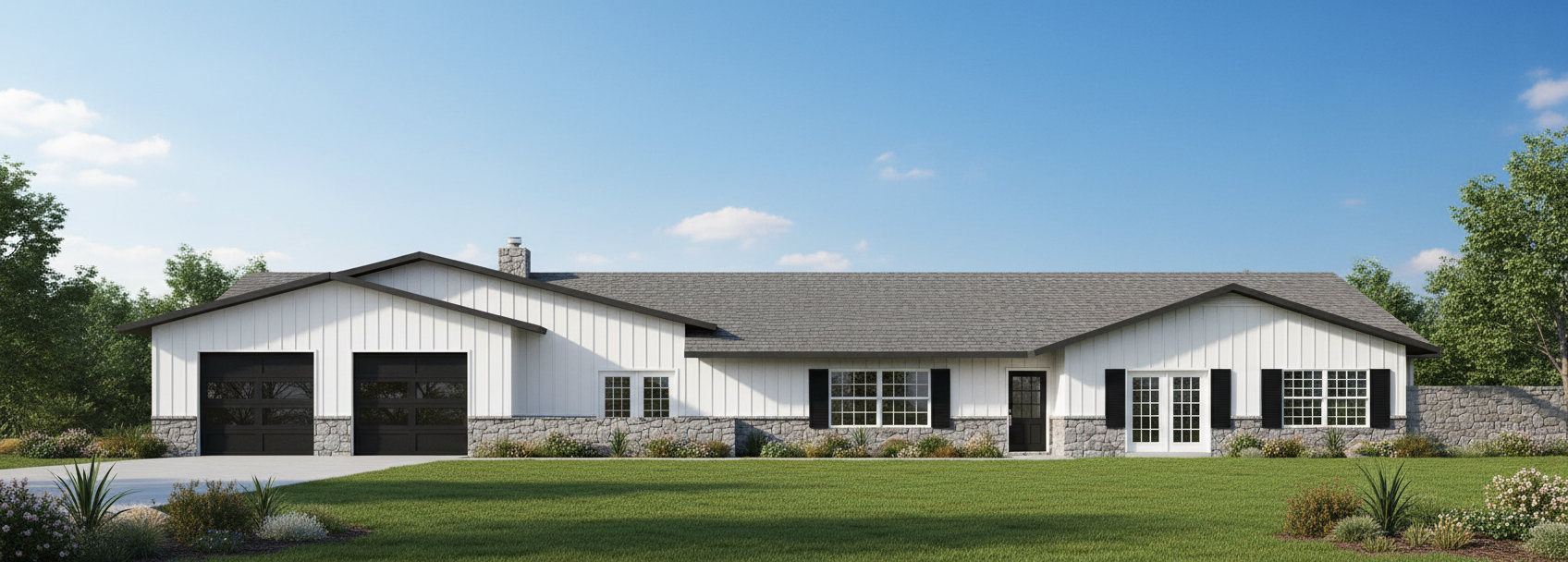 a modern ranch style structure with the following features 1 medium gray asphalt shingles 2 40 high river rock wainscot all along the front base of the house 3 the existing large window openings one located in the middle of the elevation and the two on the right hand side of the elevation are a pair of white single hung windows with divided light top and bottom windows 4 black shutters on the sides of each window 5 white vertical board batten siding from the top of the stone up to the roof overhang 6 the existing front door is aligned in the same plane as the front windows to the left the door panel is black and has a 9 section divided light window in the top half of the door 7 the glazing to the right side of the garage is a pair of 36 wide white arcadia patio doors with divided lights 8 there will be a 3 high river rock faux rock wall panel courtyard wall extending 16 to the right side of the garage 9 the sectional garage doors will be black with a 3 long x 6 window on the right end of each panel 10 the existing chimney will have river rock that matches the house wainscot no other options allowed stay specifically with my instructions