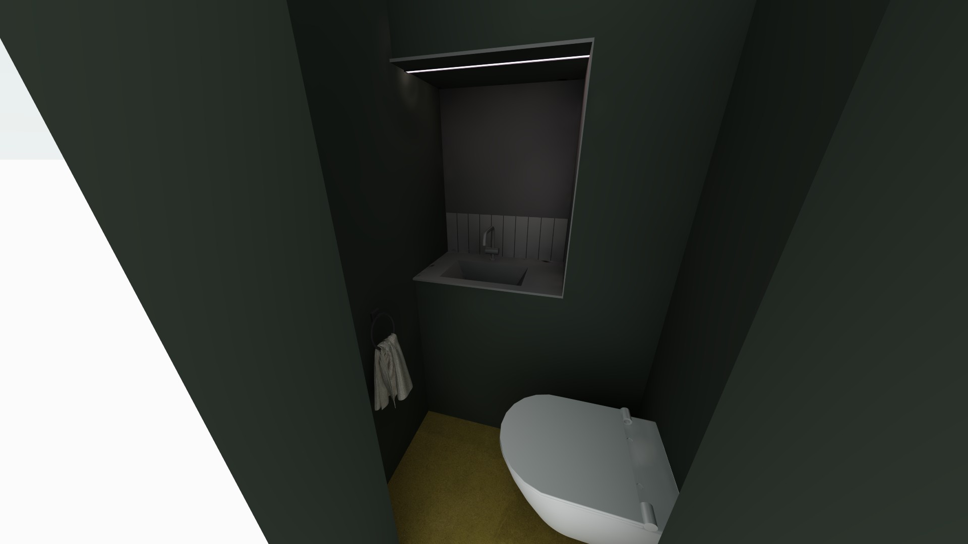render this image with realistic materials keep room geometry exactly as in the input add light to the lamps in the ceiling make the wall in the back of the niche white tiles at the bottom and a mirror covering the entire surface in top all walls is a dark and warm coloured plaster no tiles on walls transform the picture into a varm and nice toilet with cool designer stuff render this image with realistic materials keep geometry exactly as in the input make it look nordic cool no modifications to openings windows or roof shape change the material of the interior window reveals to polished and reflecting steel add a soap by the sink