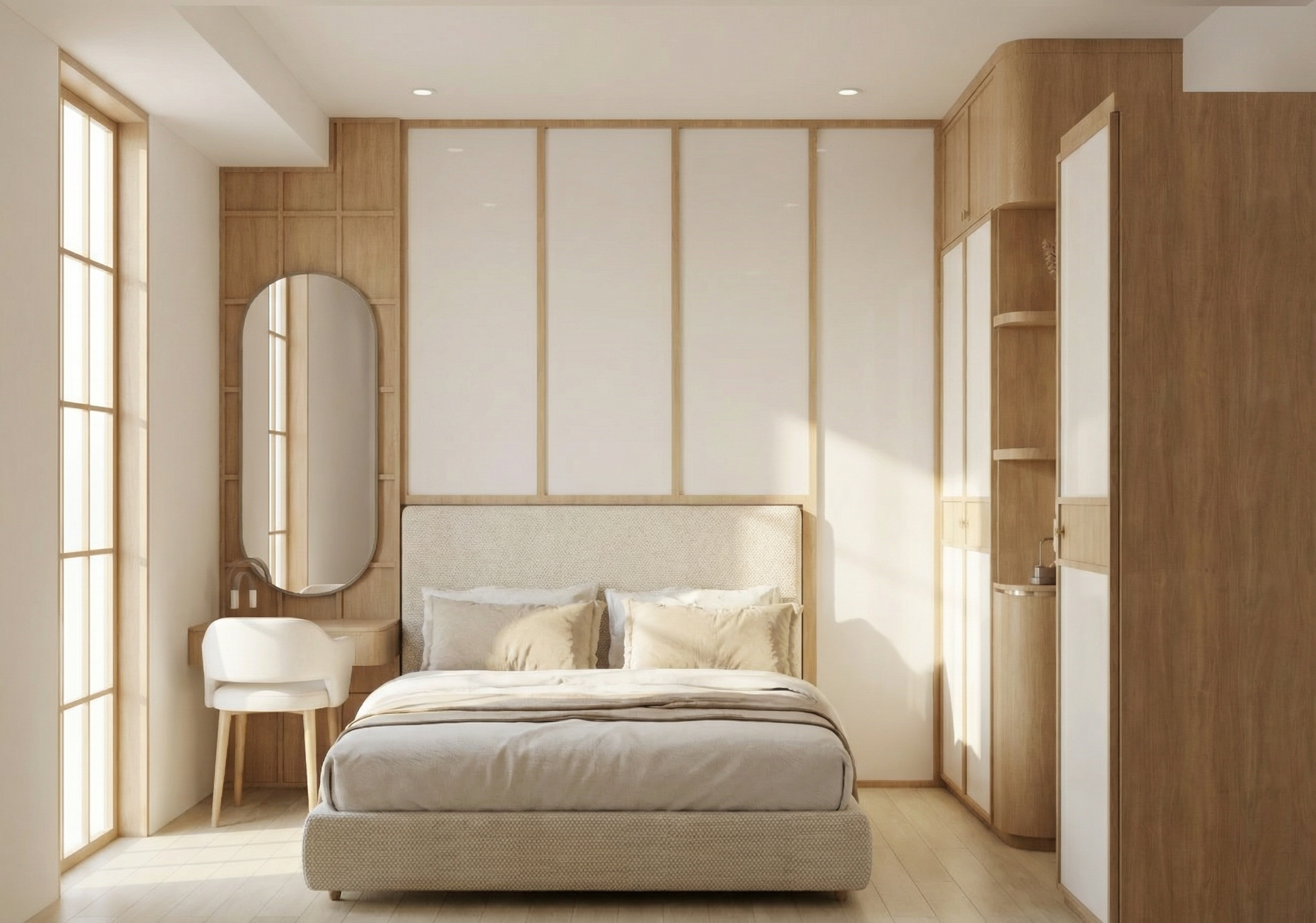 render snyata mungkin vinyl krim tanpe merubah bentuk dan material plafon puith diatas panek headboard adalah panel cermin fabric kursi warna beigi