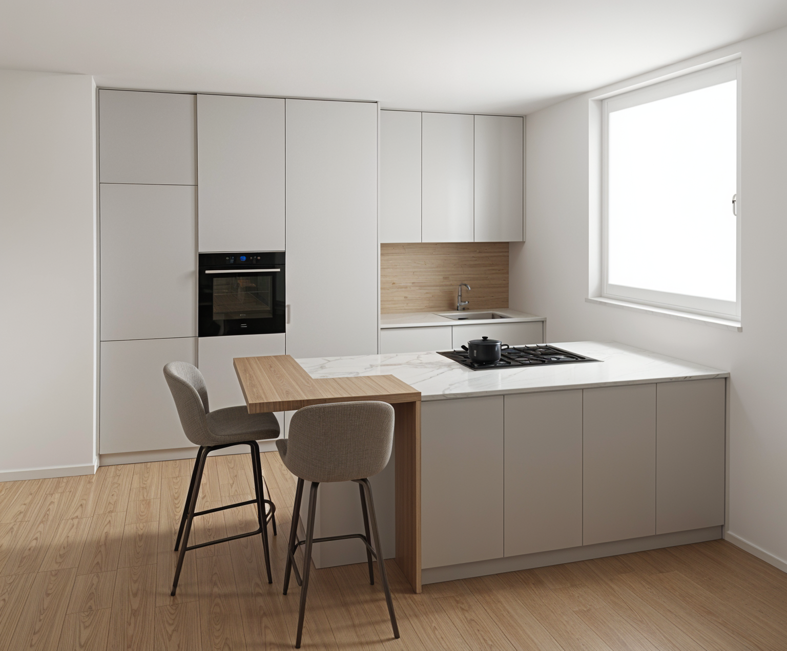 flawless dull oak flooring roteted 90 degreed wall and ceiling white painted cabinets fundermax 0071 fresko ap countertop dekton marina silvercoast without handls background over the sink in oak oven boraxbo egde on the counter in oak cookingpanel bora classic with gas cabinets under the counter fundermax 0071 fresko whitout handls outside of the cabinet body in fundermax 0071 fresko cabinets over the sink in fundermax 0071 fresko