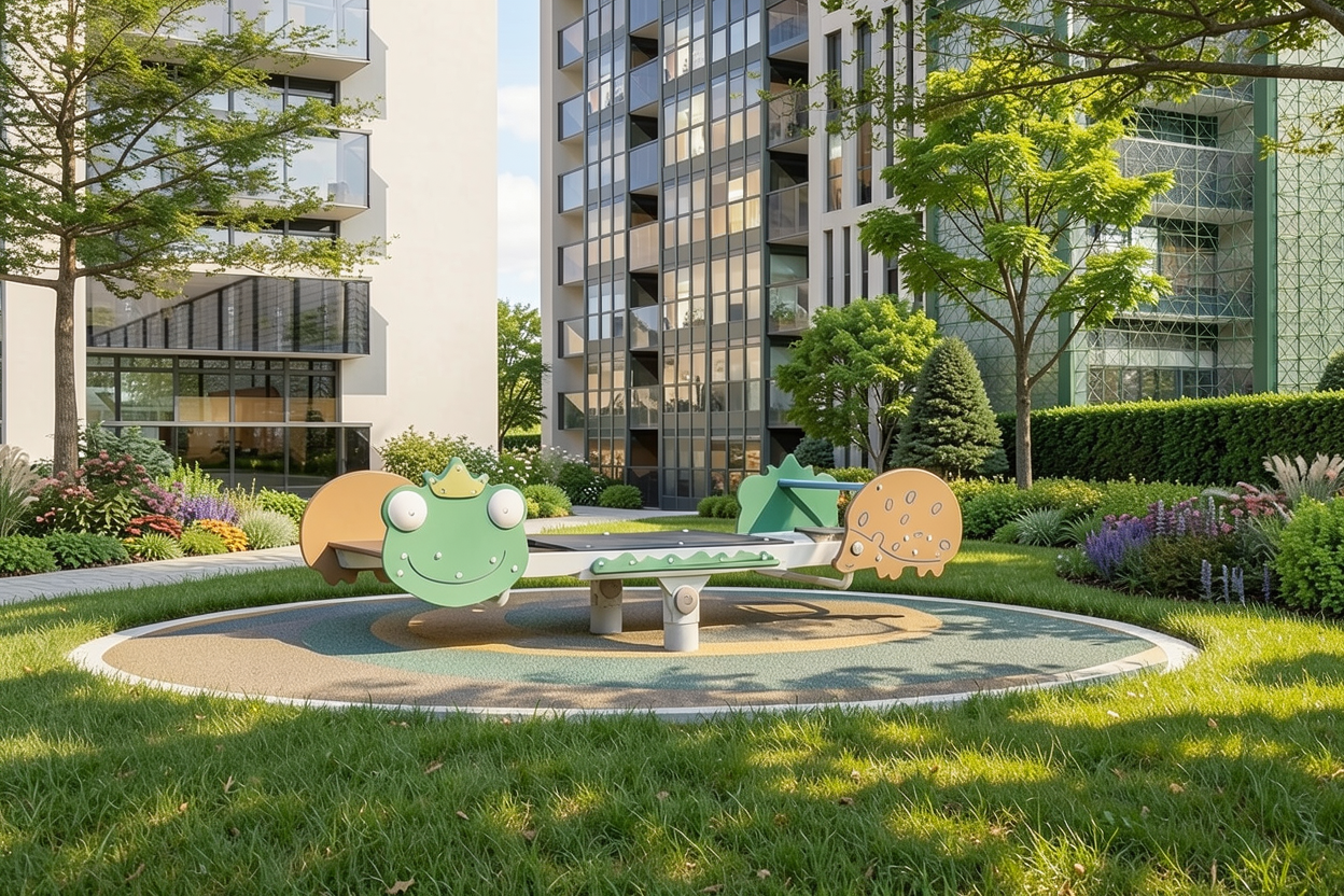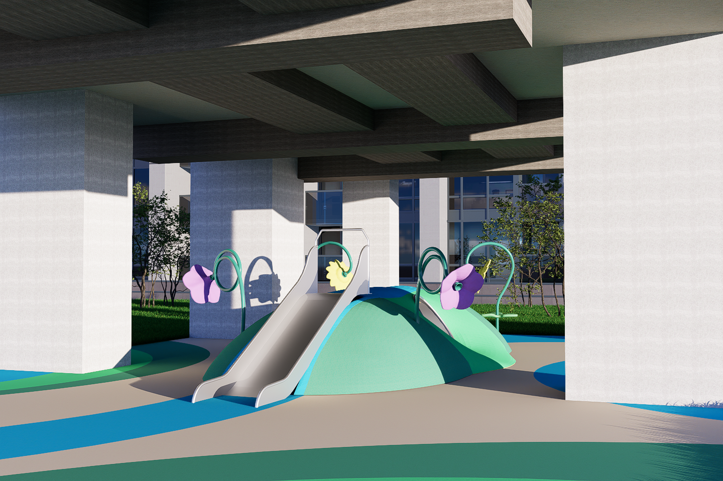 don t change the ground playground epdm colour do not change the original playground layout or angles the setting should remain clearly outdoors surrounded by lush well maintained landscaping including mature trees layered shrubs shrubs and hedges should form a boundary separating the playground from adjacent areas the ground treatment around the playground should consist of well kept grass and appropriate outdoor safety surfacing blending naturally into the surrounding lawn and landscape at the left handside is tennis court add realism