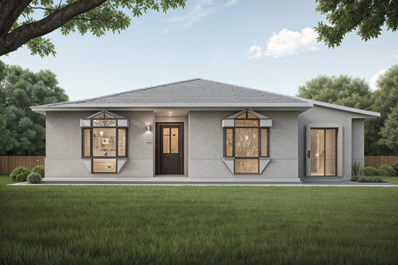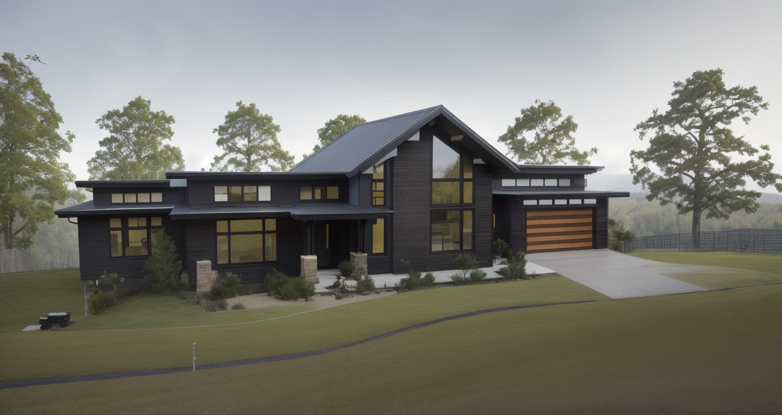 grainy brushed watercolor rendering of modern house with black and medium tone warm wood siding surrounded by oak tree forest and leafy forrest floor dense forest background architecture