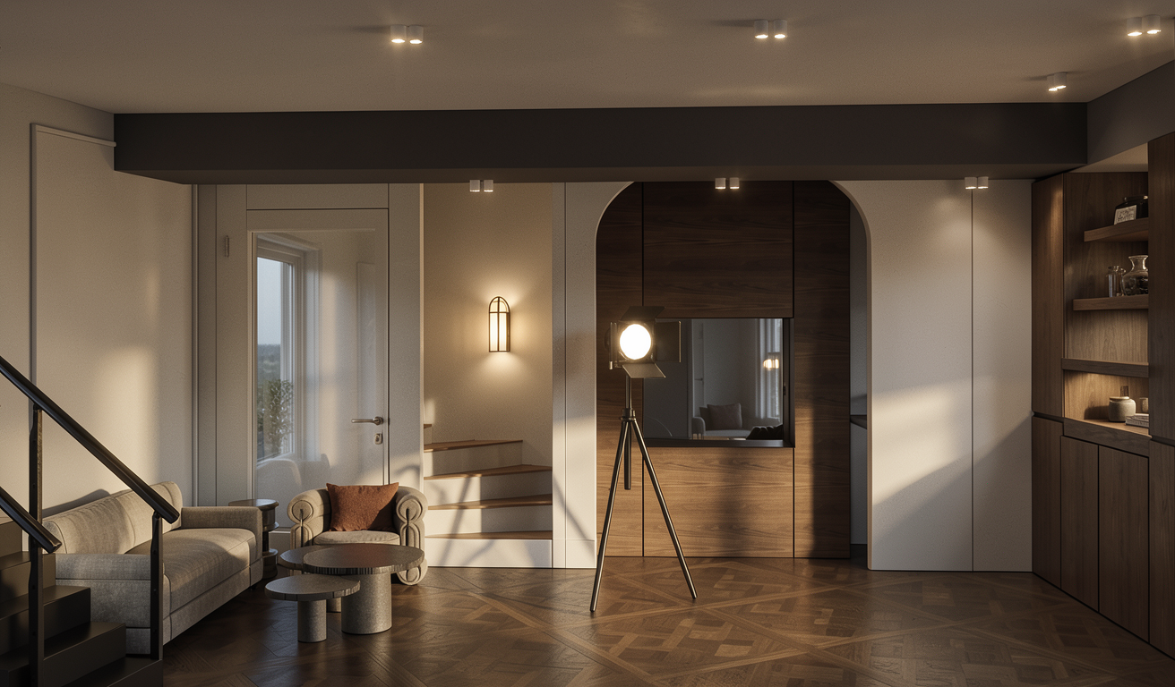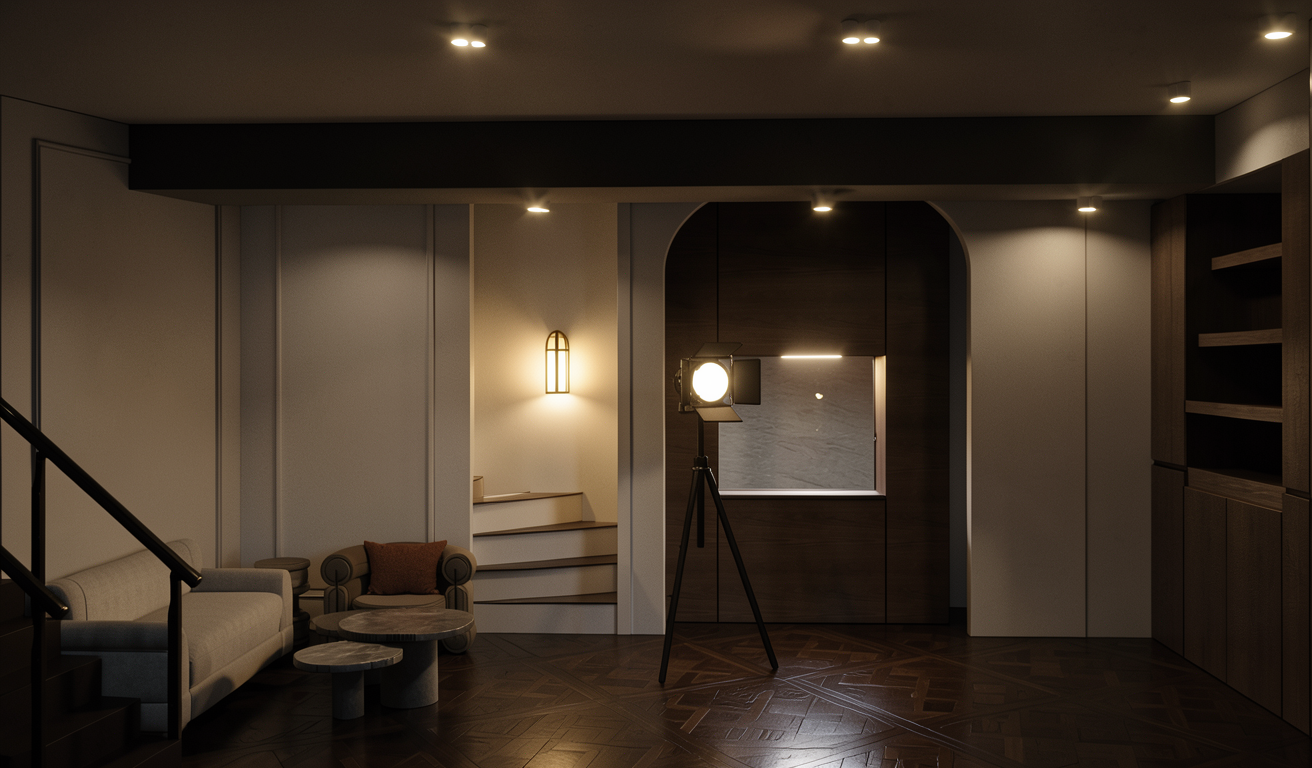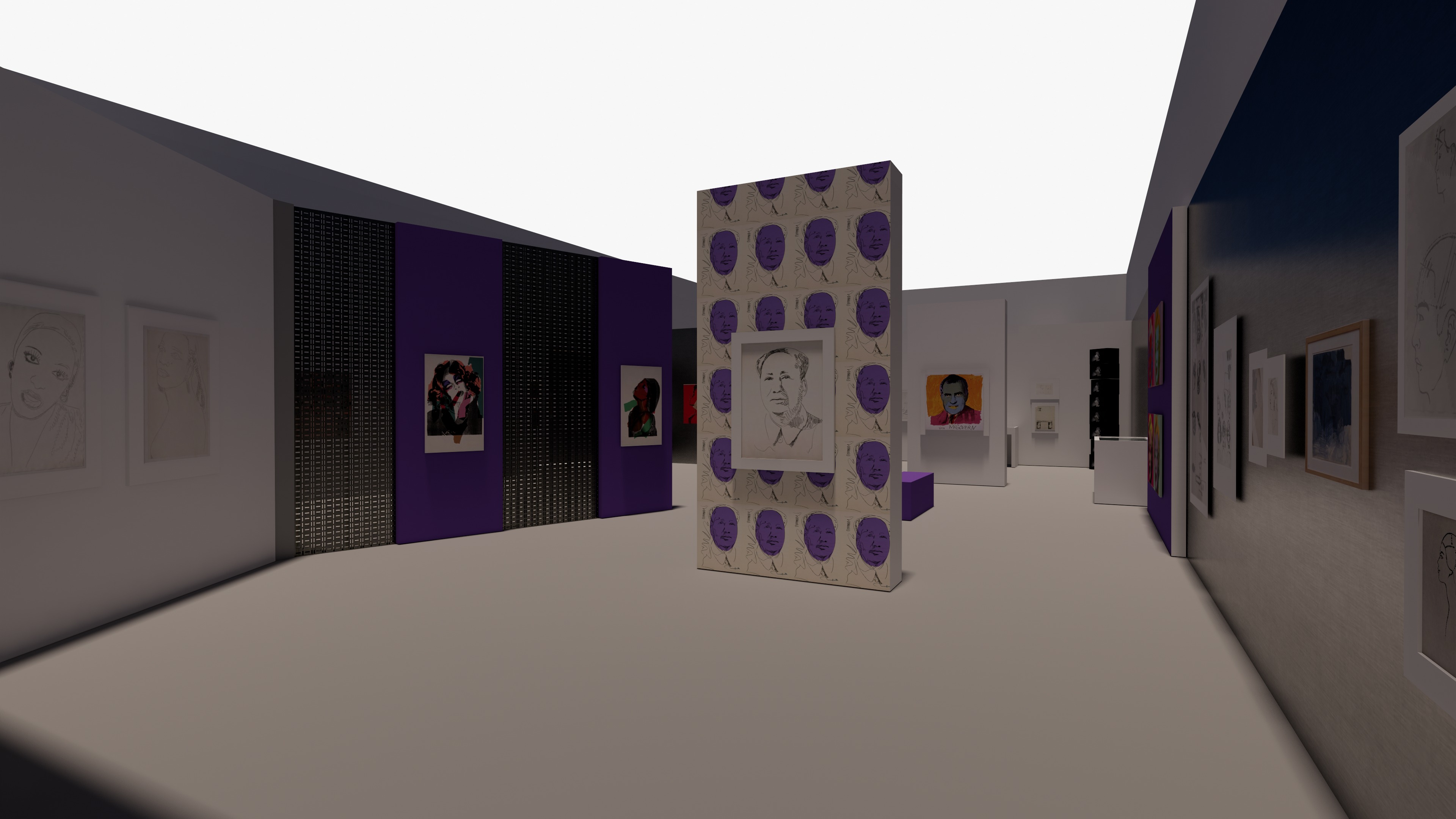 add dramatic museum lighting soft spotlighting on artworks on the walls subtle volumetric light beams in the air low ambient light cinematic contrast realistic shadows high end exhibition design photography volumetric lighting from ceiling projectors soft diffused glow atmospheric depth realistic light scattering immersive exhibition environment enhance lighting with soft indirect ceiling lights even wall washing natural color tones minimal contemporary museum atmosphere architectural photography style high resolution architectural rendering enhance brushed metal texture subtle reflections realistic light interaction soft highlights premium exhibition display materials add realistic museum visitors walking calmly neutral clothing tones slightly blurred for depth natural interaction scale accurate architectural visualization style ultra realistic architectural rendering professional exhibition photography 35mm lens soft depth of field high dynamic range cinematic lighting detailed materials natural human presence preserve original architecture and geometry do not modify structure
