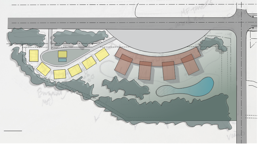 multifamily building on sloping wooded site with lake below with main road on north and east side