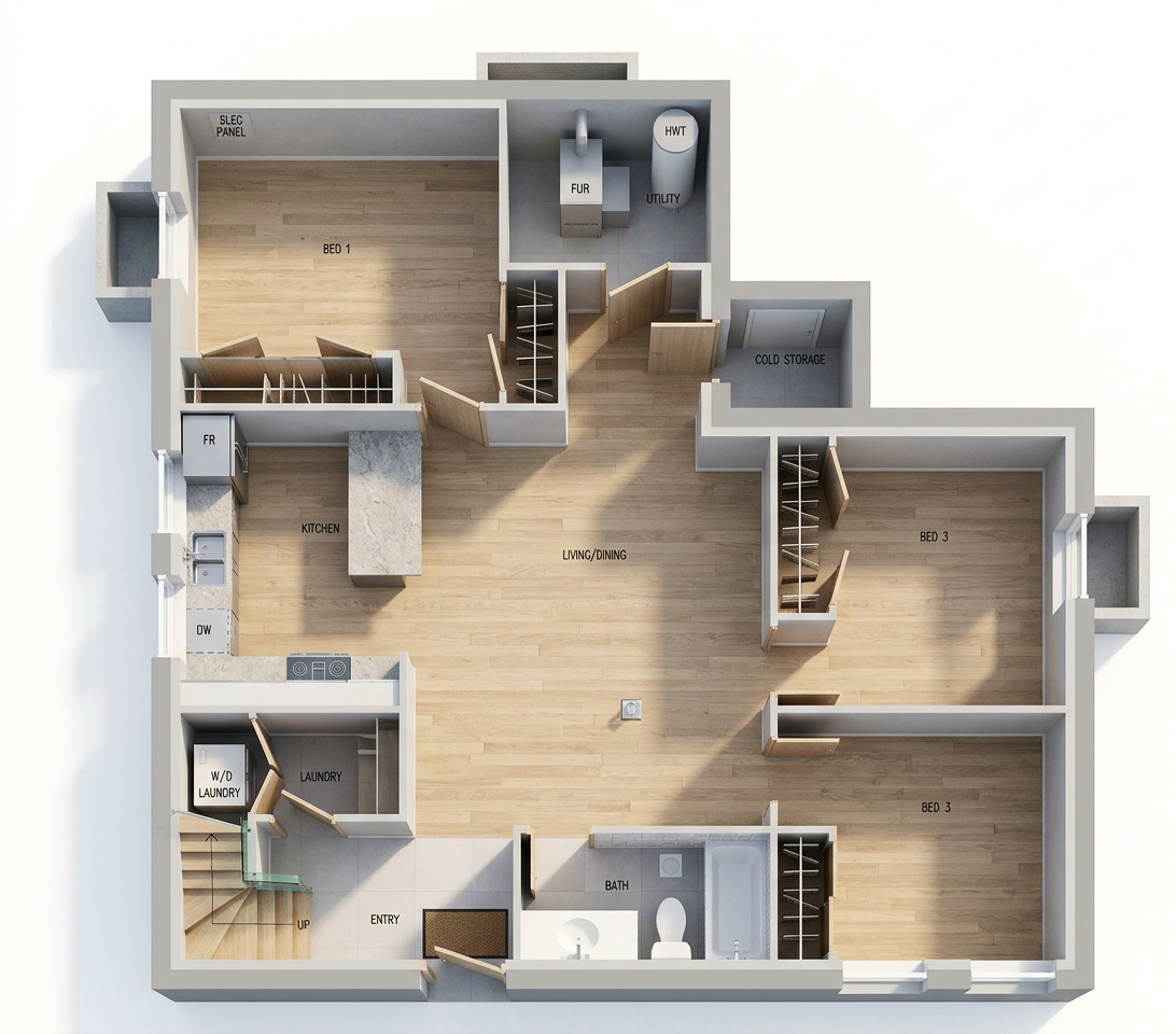 convert this floor plan into a minimalist isometric 3d view of a full house show the space from an elevated angle with furniture walls and details visible convert this floor plan into a modern isometric 3d view of a full basement apartment show the space from an elevated angle with furniture walls and details visible create a high quality isometric architectural floor plan rendering using the uploaded 2d plan as the exact blueprint critical geometry rules the floor plan layout must remain exactly identical to the source drawing do not change wall locations door placements window placements room sizes kitchen layout plumbing fixtures stairs or circulation paths do not add remove or reinterpret any architectural elements every wall opening and room must match the original plan precisely treat the drawing as a fixed architectural blueprint and only convert it into a 3d isometric visualization style clean isometric view approximately 30 45 architectural isometric angle cutaway dollhouse style with no roof realistic but minimal architectural materials modern interior finishes light wood floors neutral walls soft textures high end architectural visualization stylevisual quality bright natural lighting soft shadows high clarity and sharp detail professional architectural rendering quality balanced staging with minimal furniture to help understand the layoutconstraints do not alter proportions do not redesign rooms do not reinterpret the floor plan the goal is visualization not designoutput a visually appealing isometric 3d rendering that exactly matches the provided floor plan and is suitable for professional marketing material use the same furniture as shows on the plan do not change the orientation of the floorplan use the same furniture as shows on the plan do not change the orientation of the floorplan
