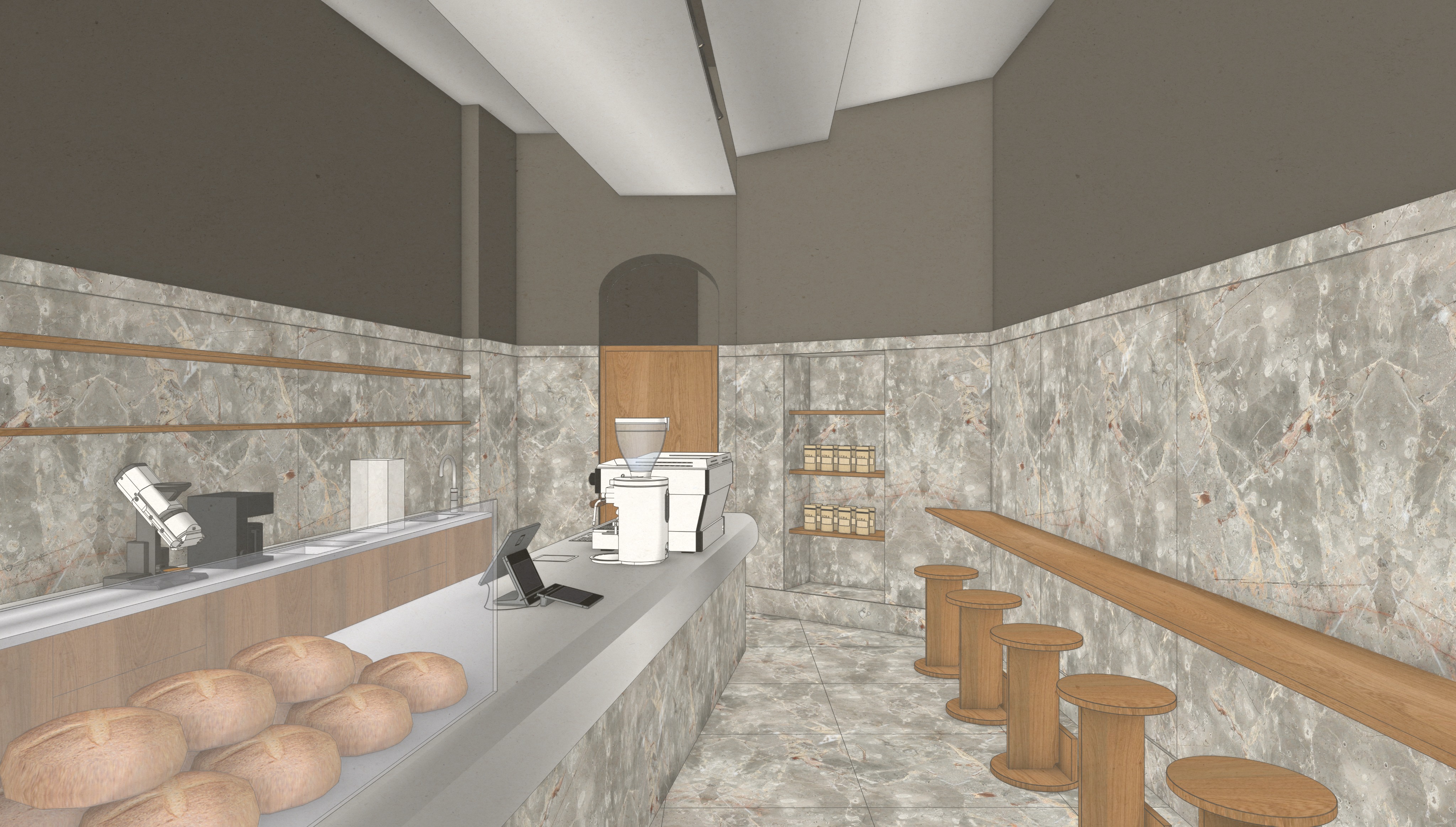 create a photorealistic architectural interior rendering from this image preserve the exact geometry layout furniture wall positions and camera angle do not change or redesign any architecture black mahlk nig m hle e65s and la marzzocco coffe machine blender on the back counter next to the black aiden filter coffe machine the rounded counter top in polished stainless steel style ultra realistic architectural photography physically based materials high detail warm oak wood tones