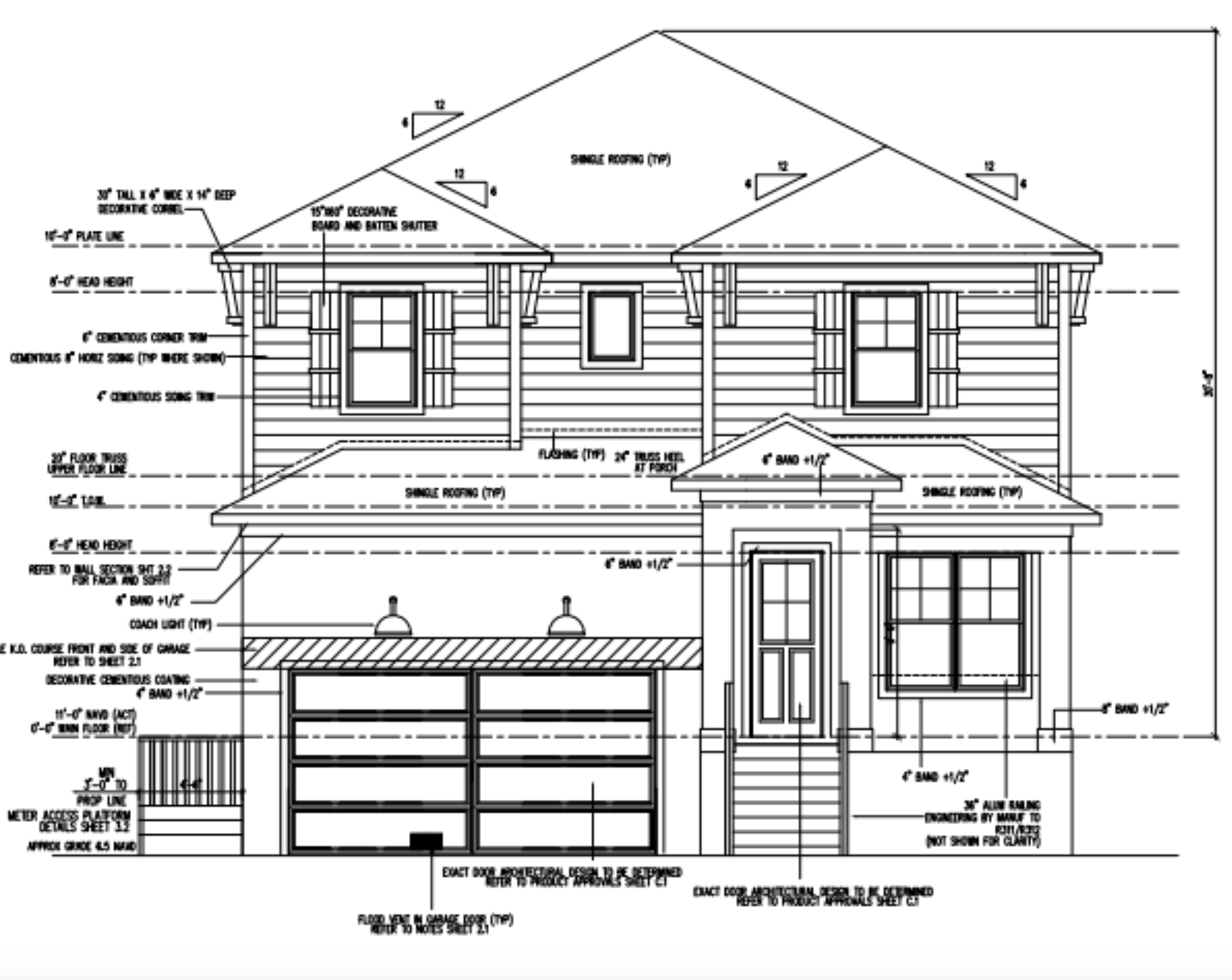 use these architectural drawings to create a front elevation rendering color should be a warm white with a white trim garage door to be a coastal style with windows at the top and the same color as the trim front door to be a wood tone first floor to be stucco second floor siding