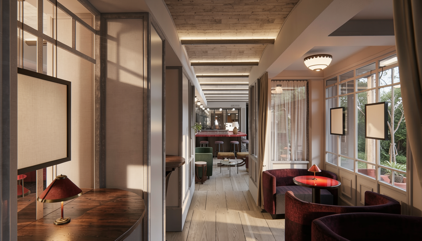 this is a rendering of an equinox gym reception area there should only be 4 horizonta l lines of light equally spaced between the floor and the ceiling