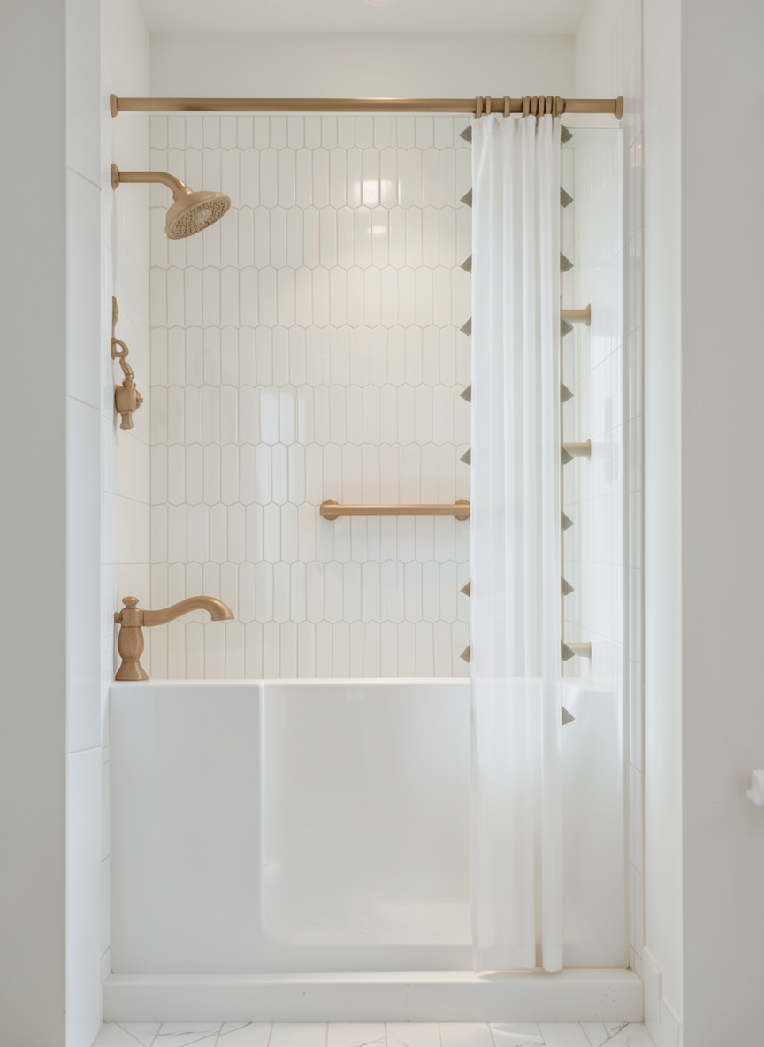 the tiles are popscicle tiles white the walk in tub is all white no gold trim
