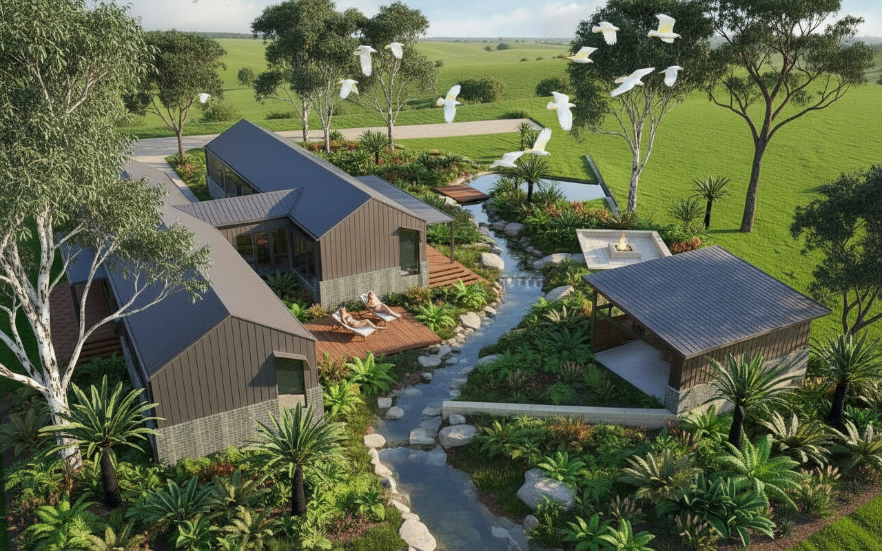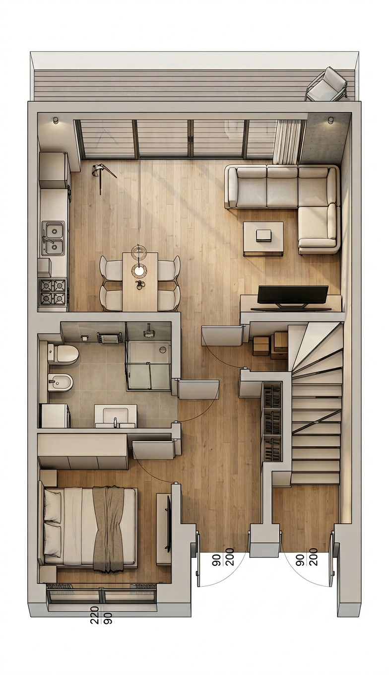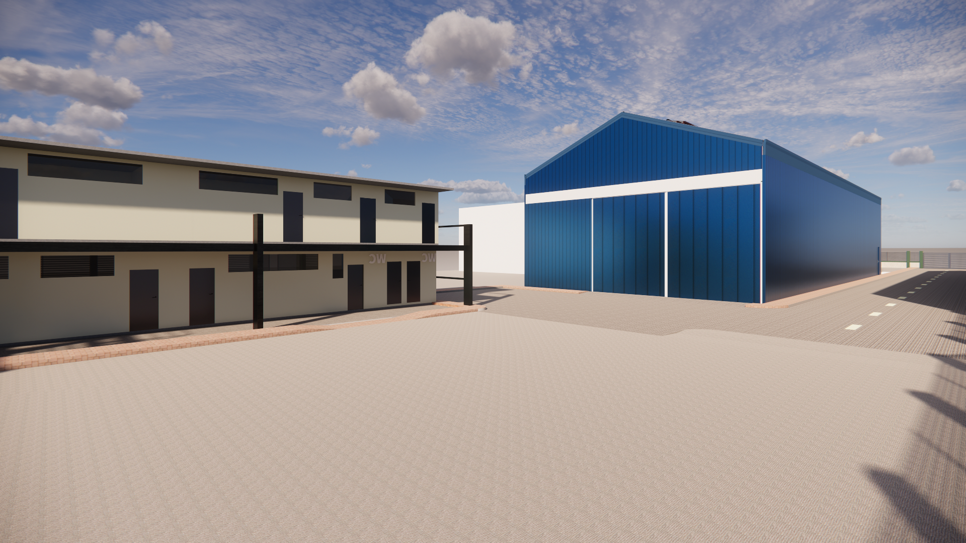 photorealistic architectural rendering enhancement of an industrial warehouse complex in a warm coastal environment maintain the exact geometry proportions layout and architectural design from the original render with no structural modifications the large warehouse building on the right should feature realistic vertical corrugated metal cladding with visible ridges subtle weathering light reflections and natural panel seams the blue metal panels should have slight variations in tone and reflectivity accurately responding to sunlight the ground surface and roadways should be dark grey goudron asphalt with a slightly rough texture subtle tire marks faint patching and natural surface variation typical of industrial yards edges between asphalt and sidewalks should be clearly defined the smaller structure on the left should read as a prefabricated modular building with realistic panel joints metal framing and construction seams typical of prefab office or utility buildings materials should appear slightly utilitarian but well maintained windows should be slightly transparent glass showing subtle reflections of the sky while still allowing faint interior visibility glass should have realistic thickness and light reflection lighting should be natural midday sunlight with physically accurate shadows global illumination and soft bounce light from surrounding surfaces the sky should remain bright with scattered clouds producing realistic light diffusion add subtle environmental realism such as slight material imperfections mild dust accumulation typical of industrial zones realistic metal edge highlights physically accurate reflections and shading overall the image should appear highly photorealistic like a professional architectural visualization or drone photograph while strictly preserving the original architectural integrity building shapes camera angle and spatial layout