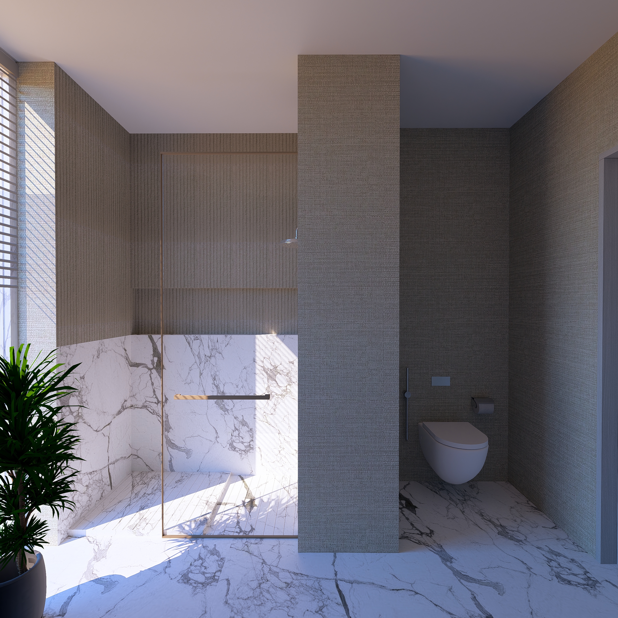 ultra realistic bathroom interior photorealistic architectural visualization natural daylight coming from left window soft global illumination realistic shadows physically based rendering pbr high quality marble textures with natural imperfections subtle roughness variation realistic fabric wall texture accurate scale and proportions modern minimalist luxury bathroom glass shower panel with realistic reflections and refractions slight water stains and micro details realistic toilet ceramic material ambient occlusion cinematic lighting depth of field 8k resolution professional interior photography shot on full frame camera 35mm lens neutral color grading no overexposure no artificial look