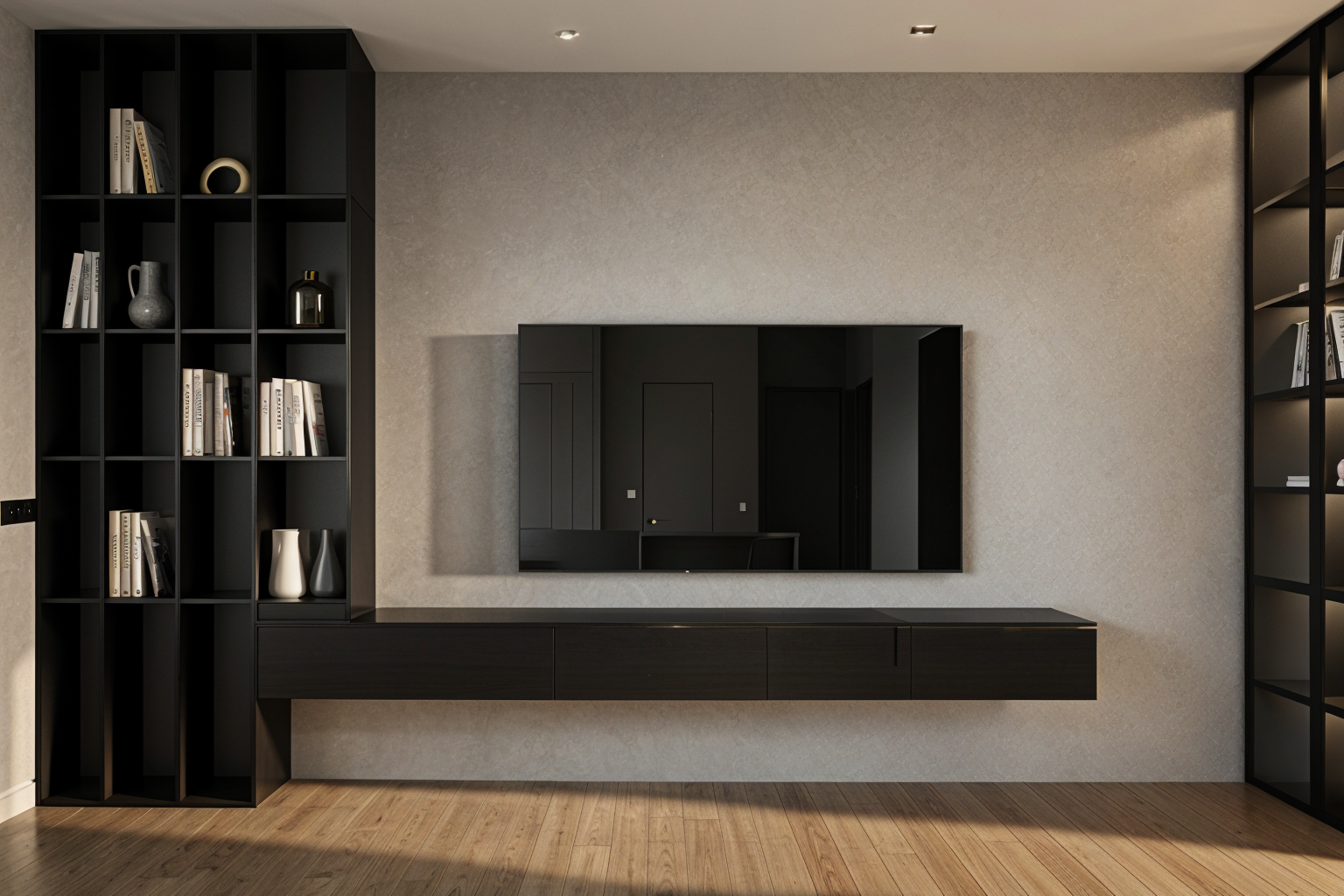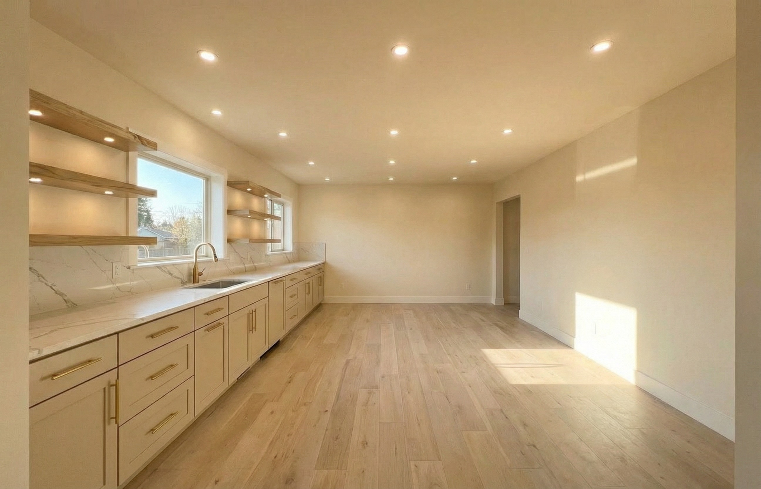 use the existing cabinets along the left wall as the base extend the countertop and base cabinets from the far end of this run closest to the back opening and turn 90 degrees into the room to create an l shape peninsula the extension must project perpendicular from the left wall into the room not along any other wall do not place cabinetry on the opposite wall do not mirror or flip the layout align the peninsula with the existing cabinet height depth and perspective