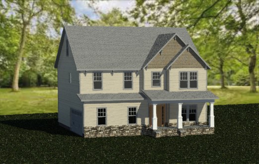 this is a house with cream horizontal siding it has a brown asphalt shingle roof windows are white it has a stone foundation add plants and trees add a concrete driveway from the garage and a path from the porch