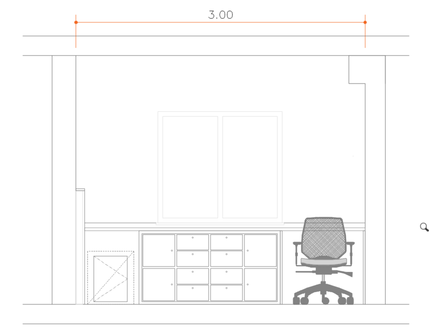vista frontal de uma parede piuntada de branco com uma janela branca de vidros transparentes bancada de estudo tampo branco rodameio branco e estrutura de nixos em madeira carvalho na vista lado direito cadeira de escritorio cinza claro cxoim rodicios na vista esquerda frente de armario pequeno abaixo do tampo com uma pequena porta de abrir co chave