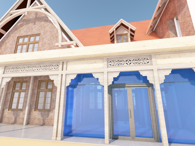 render a facade use oker plaster insted of brick make the wood darker oak wood