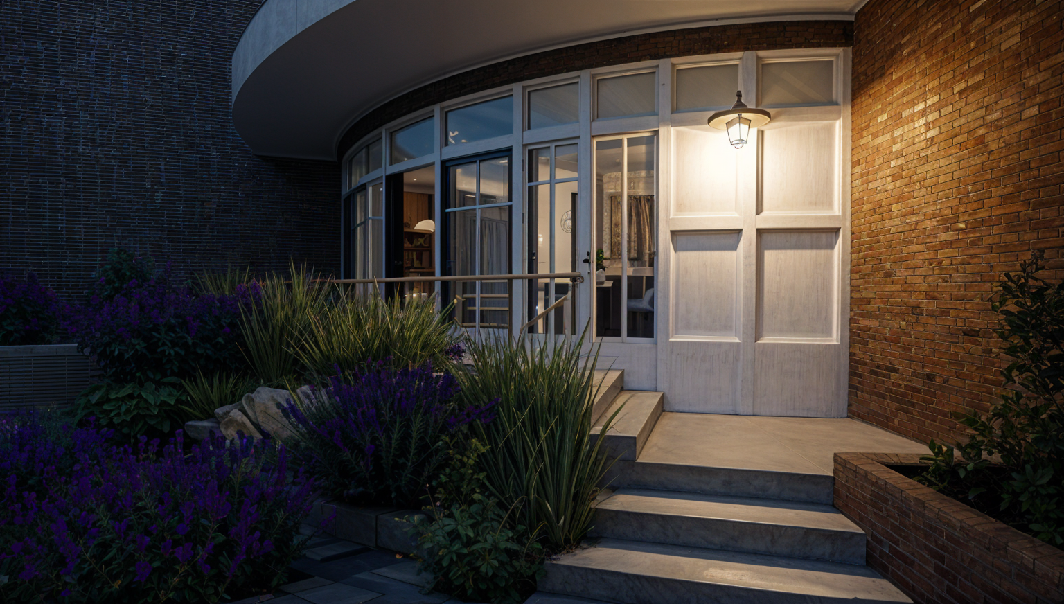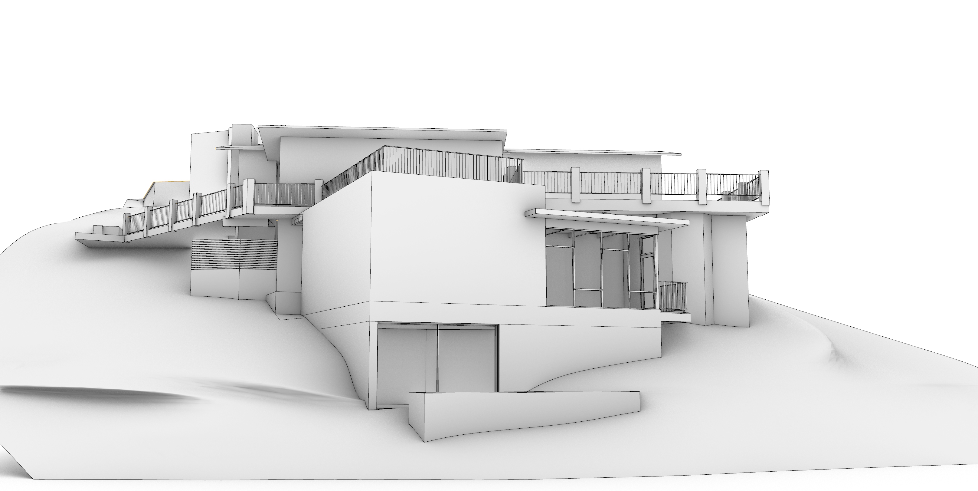 house is in the hills of los angeles the lower portion should be grey cement colored stucco the window wall and roof on the right should be exposed wood framing and the deck next to that should be exposed wood framing with black metal railing