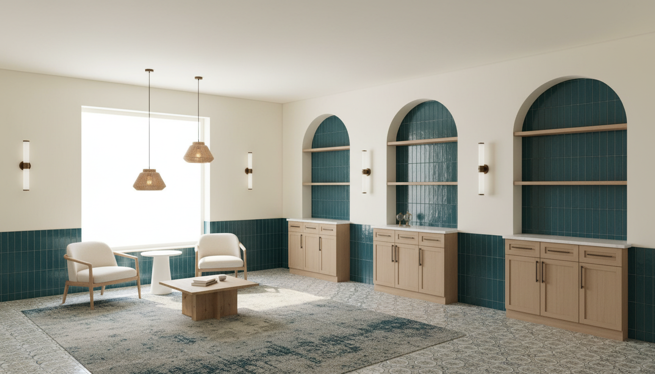 add people making clothing and accessories in the room with the glass wall show exposed structure above the green ceiling clouds make it painted white