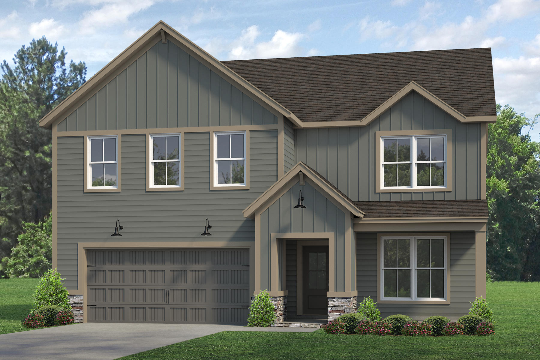 make this rendering more interesting but do not change the colors or any structural aspects of the home make it a bright dusk summer day