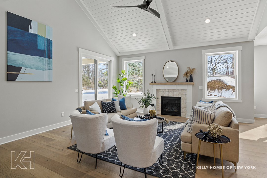 change the style of this living room to a modern farmhouse leave all structural elements as is and untouched simply update the walls to be a white the white shiplap ceiling to a white wash and the larger ceiling beams to be a natural cedar wood tone include a barn beam that compliments the ceiling as the mantle above the fireplace and a natural stone veneer under the mantle and fireplace surround include a roughly 10 from the floor stone hearth