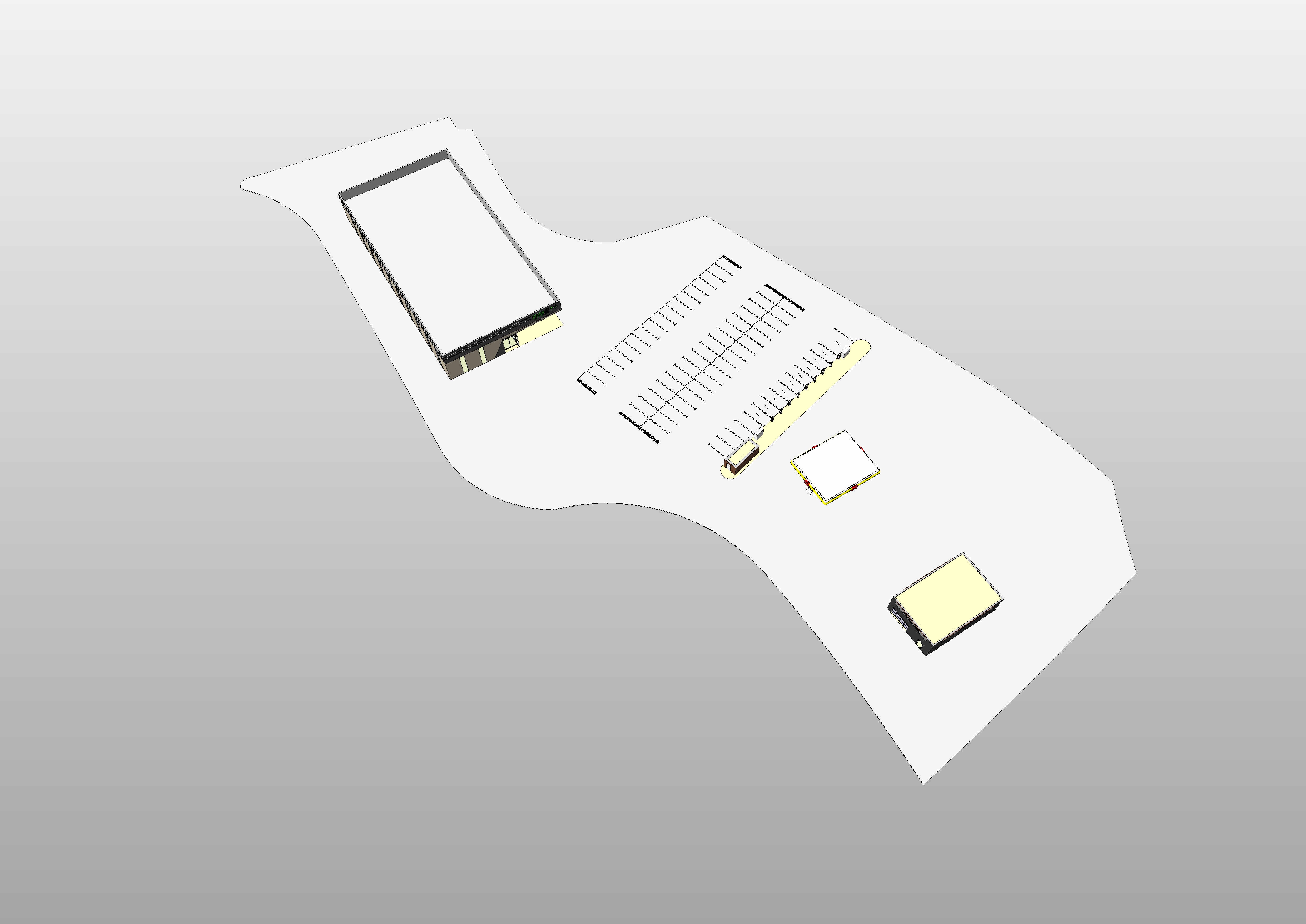 parking lot in front of the store add a few cars sunny weather blue sky slightly overcast small trees in the background in some distancnce in the background flat green areas don t change the perspective