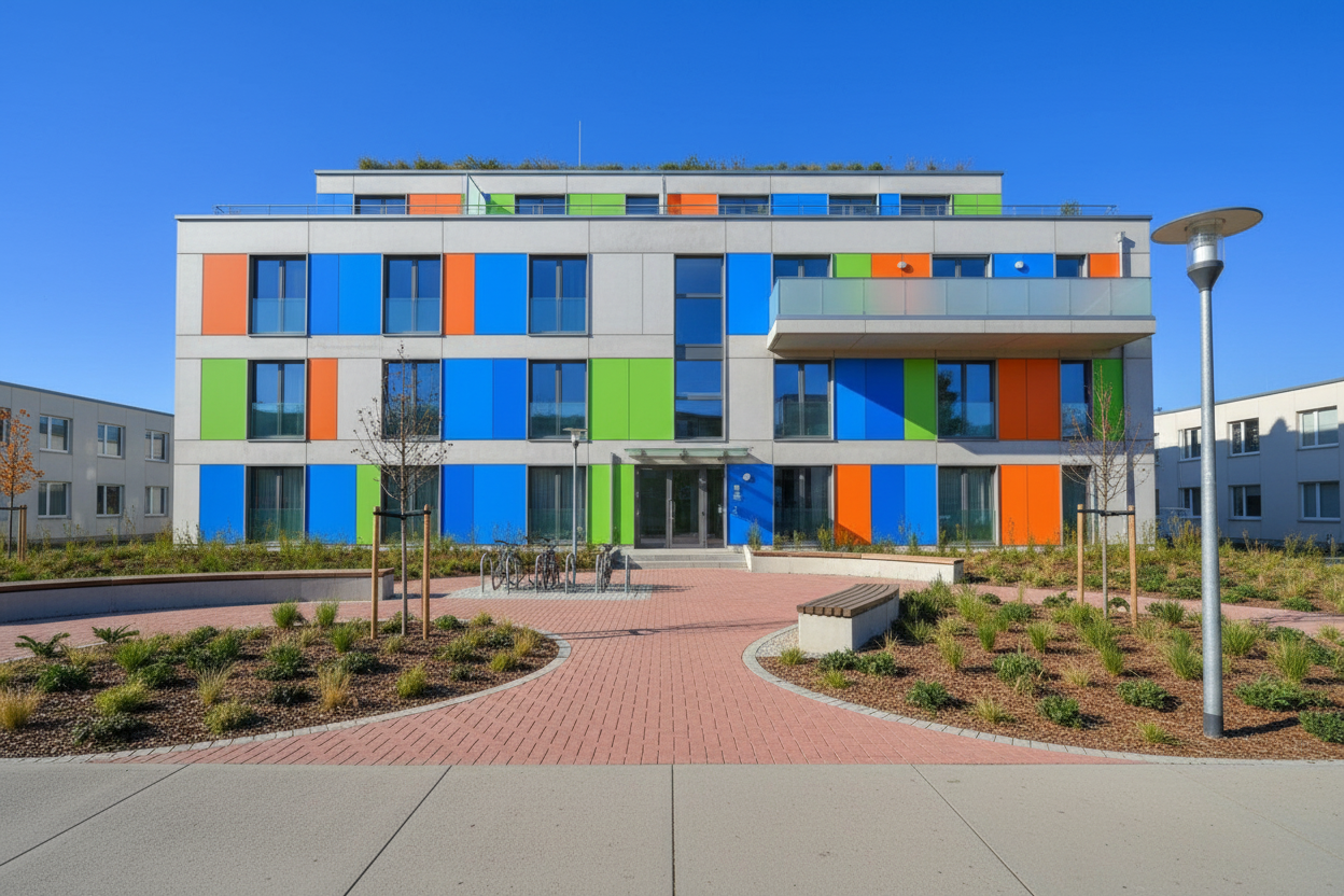 clean modern barndominium architectural exterior home rendered in cinematic vibrant golden hour lighting with blue skies and vibrant clouds barndominium in a lush beautiful forest setting with green grass and dense trees surrounding the property warm glow and reflections off of the windows select grade horizontal white hardie siding green manicured landscape around structure with gardens and grass black standing seam metal roof high fidelity photorealistic visualization crisp shadow falloff refined facade geometry soft atmospheric depth premium architectural photography mood ultra clean composition and materials photorealistic render black trim around the windows and doors prominent trees scattered around the property black window trim and posts concrete driveway leading to the black garage doors black man door