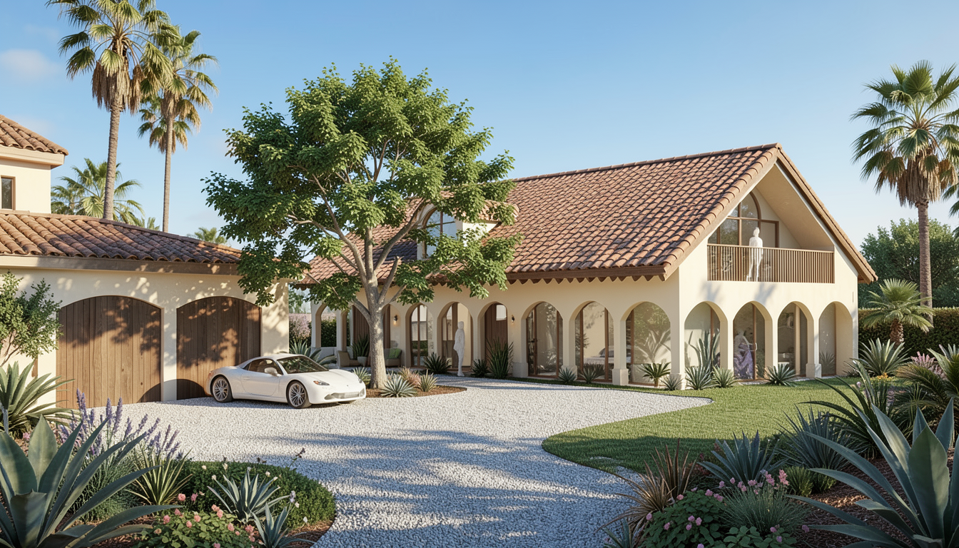 remove palm trees add lavender rosemary soft mediterranean grasses in foreground and around the base of the building keep the lawn