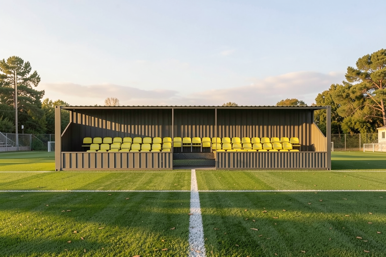 a serene soccer field basking in the golden glow of the setting sun vibrant green grass with crisp white lines a simple rectangular metal stand with bright yellow seats providing a pop of color surrounded by lush green trees and a clear blue sky with soft pinkish clouds capturing a tranquil and inviting atmosphere