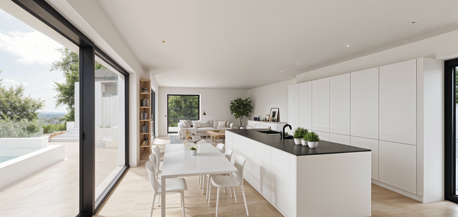 render a photorealistic 3d perspective of this house reference the current material style just enhance them light bronze decor in doors windows and garage doors keep model geometry the same windows doors roof walls garage door pavement driveway do not change the view only enhance the current materials and make the landscape nicer vegetation