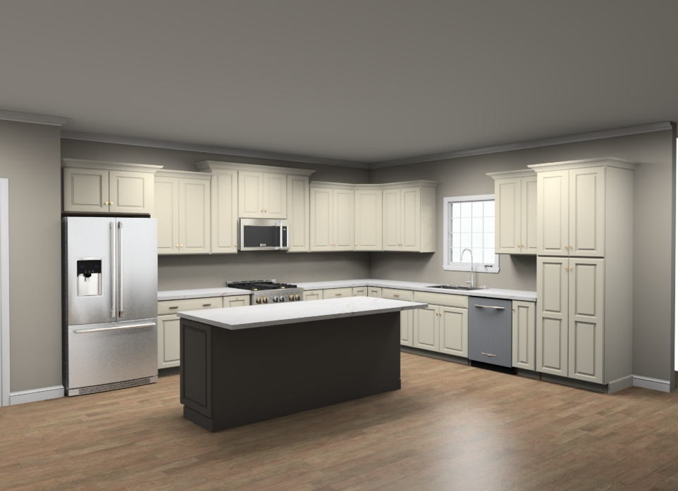 create a hyper realistic photo from this kitchen rendering add a grey subway tile backsplash and three counter stools behind the island soft interior lighting sunlight streaming through window