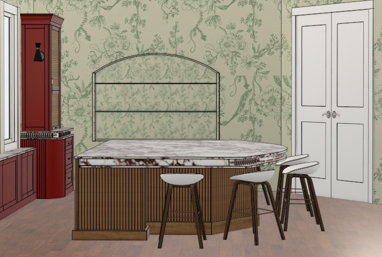 the island is rift white oak the painted cabinets are painted a dark red color the back is a recessed niche into the wall with clear glass shelves there is a brushed brass foot rail along the back side of the island