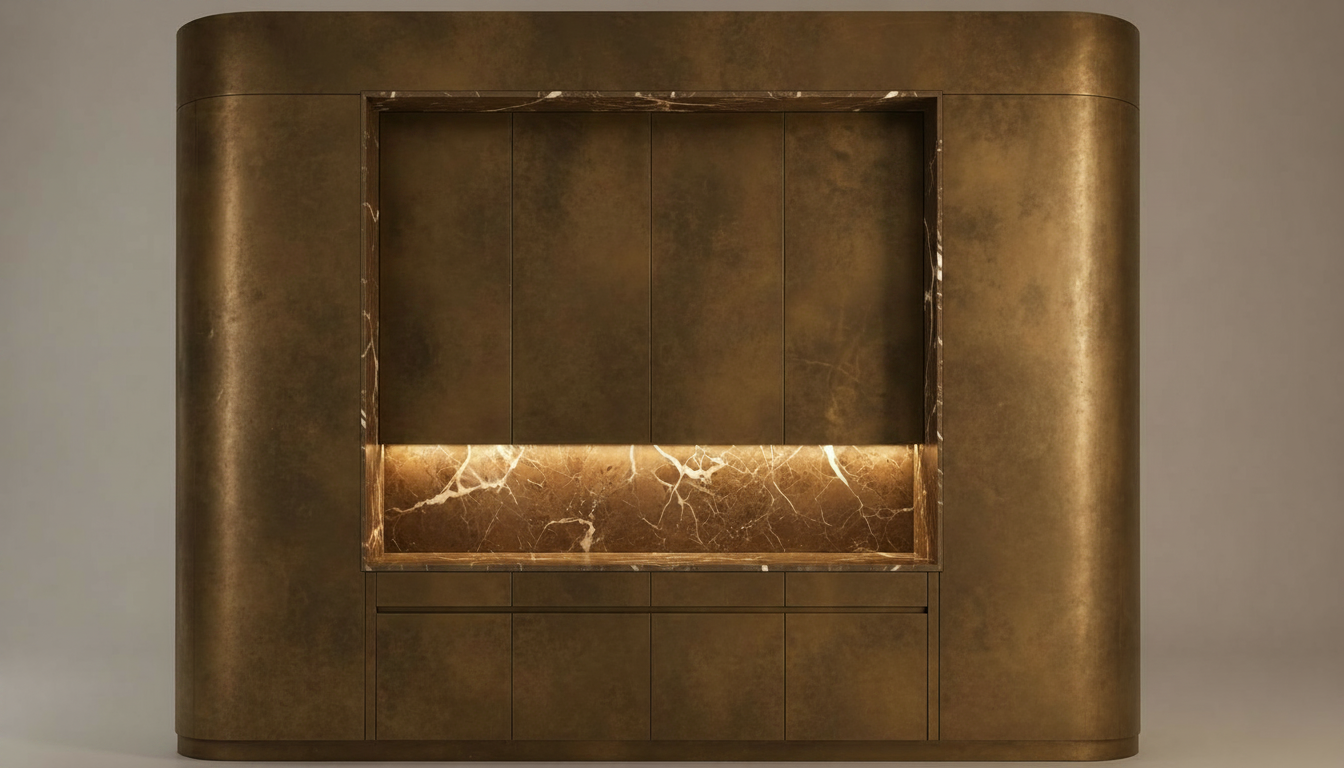 show the cabinets as brown fluted glass with nothing inside besides shelves and then show them also backlit