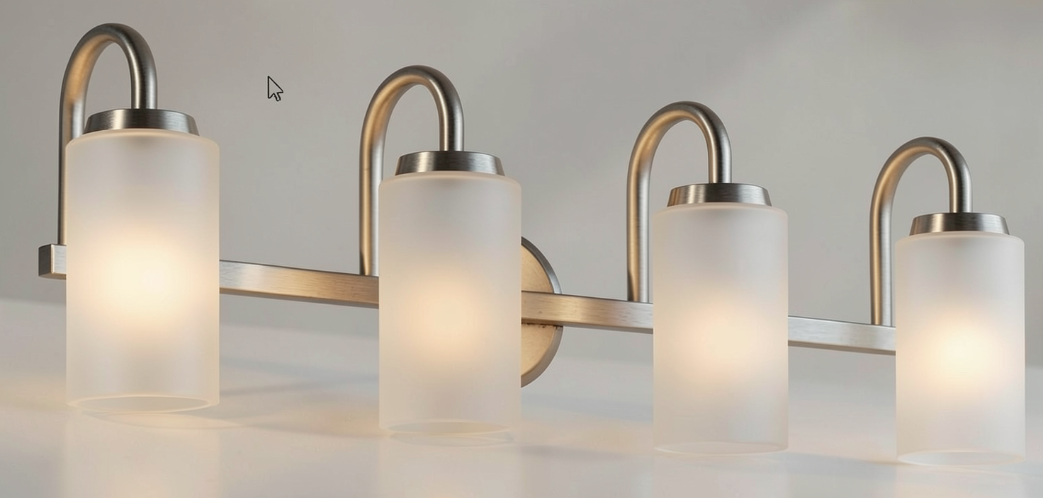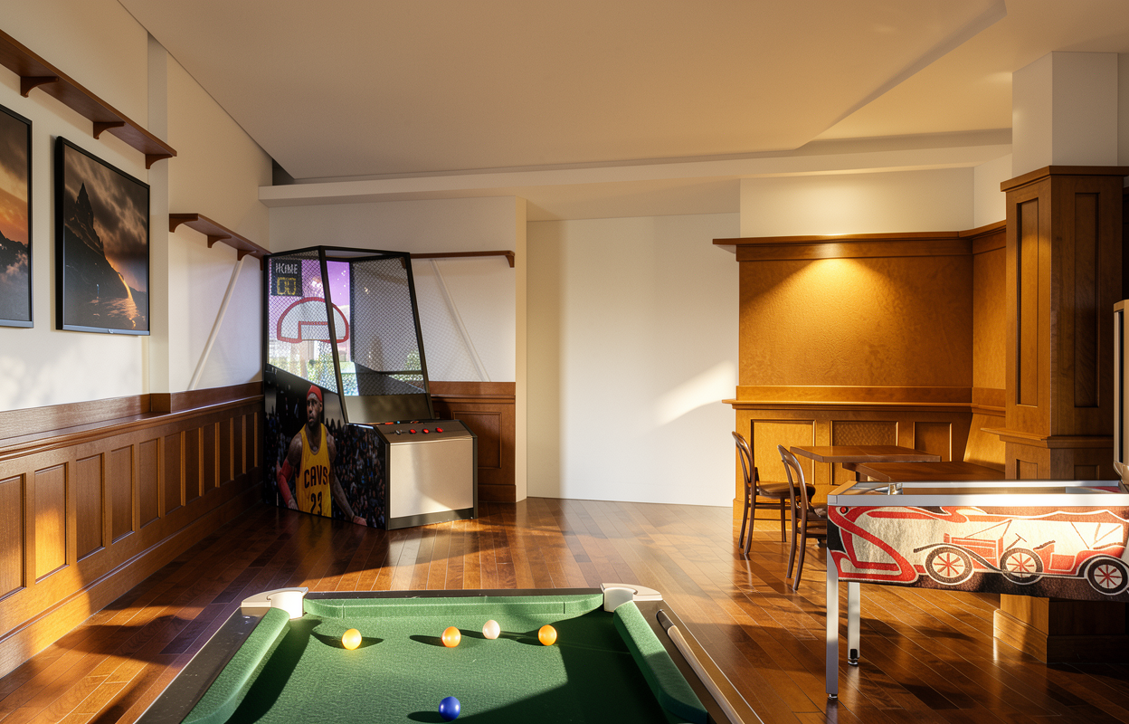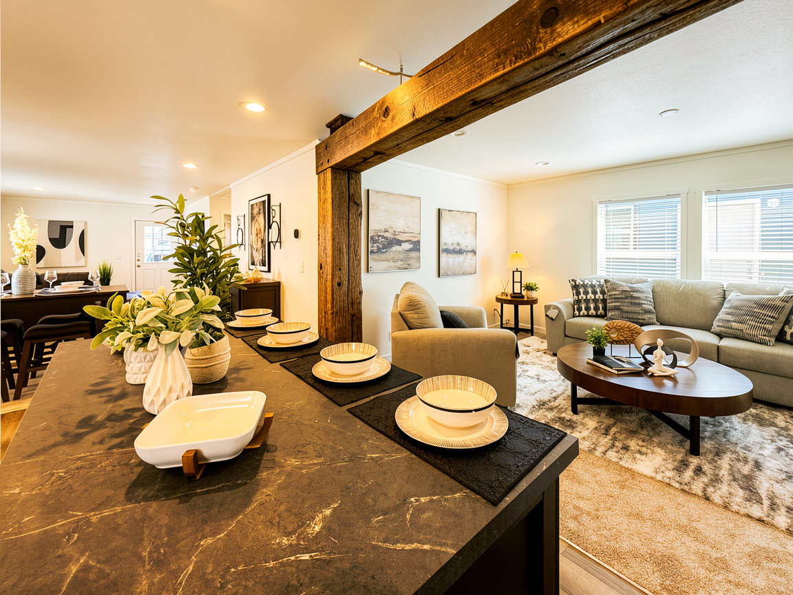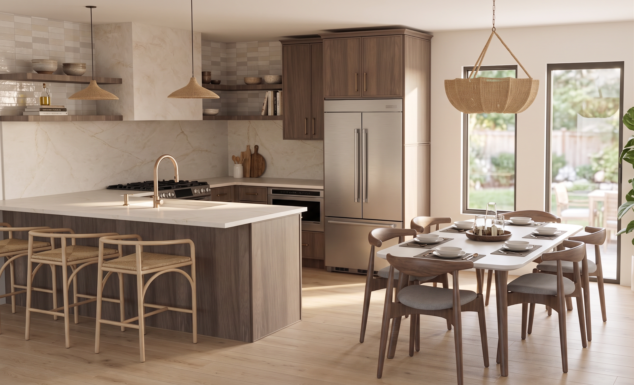 keep the exact same layout proportions camera angle and architecture do not change anything in the structure no additional shelves do not add any upper floating shelves only keep the existing lower shelf cabinets smooth cream flat panel cabinets island cabinets walnut wood finish hardware brass add a thin chair rail molding detail to the existing floating shelf add minimal kitchen styling neutral decor cutting boards ceramic bowls glassware keep it clean and not cluttered add two low wooden stools at the island keep materials lighting and colors natural and realistic no redesign