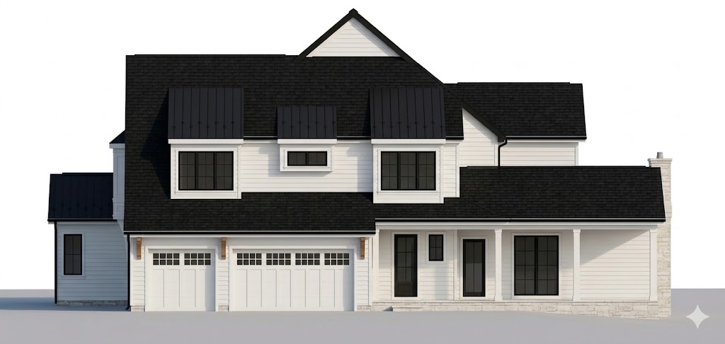 use this uploaded elevation as the base keep the structure proportions footprint rooflines and window placement exactly the same do not crop zoom or alter the size of the elevation in any way modification remove the odd middle roof the tall pitched roof with siding while keeping everything else unchanged preserve all other rooflines materials and architectural elements exactly as shown