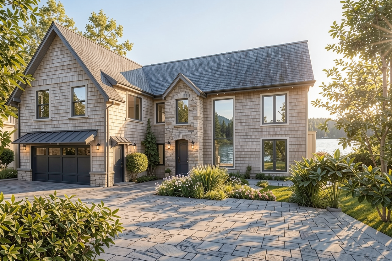 enhance this image for client presentation it should look photo realistic it is a high end country home in an exclusive lake in quebec do not change architecture at all keep colours and tones as per image keep all materials as per image do not change siding colour
