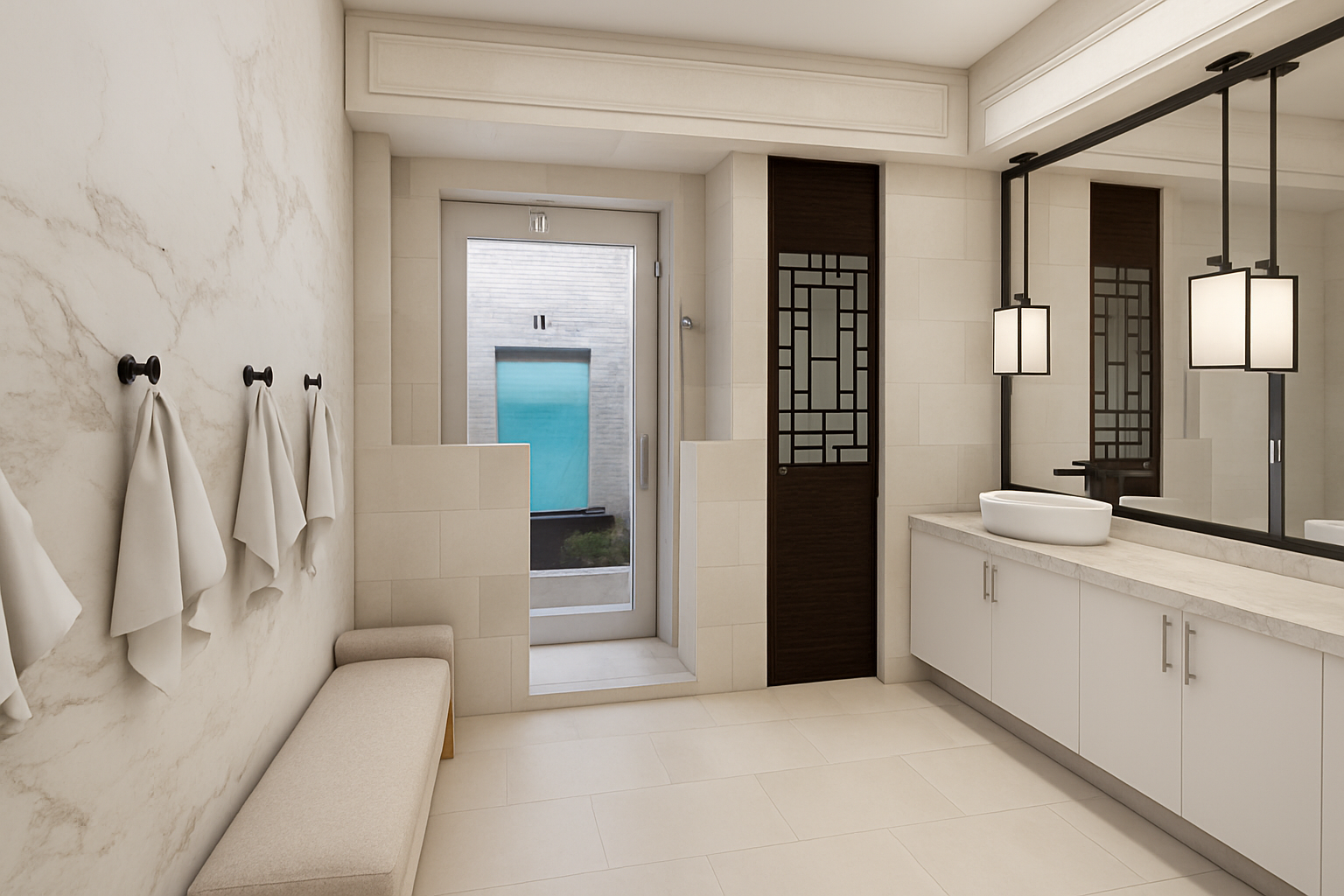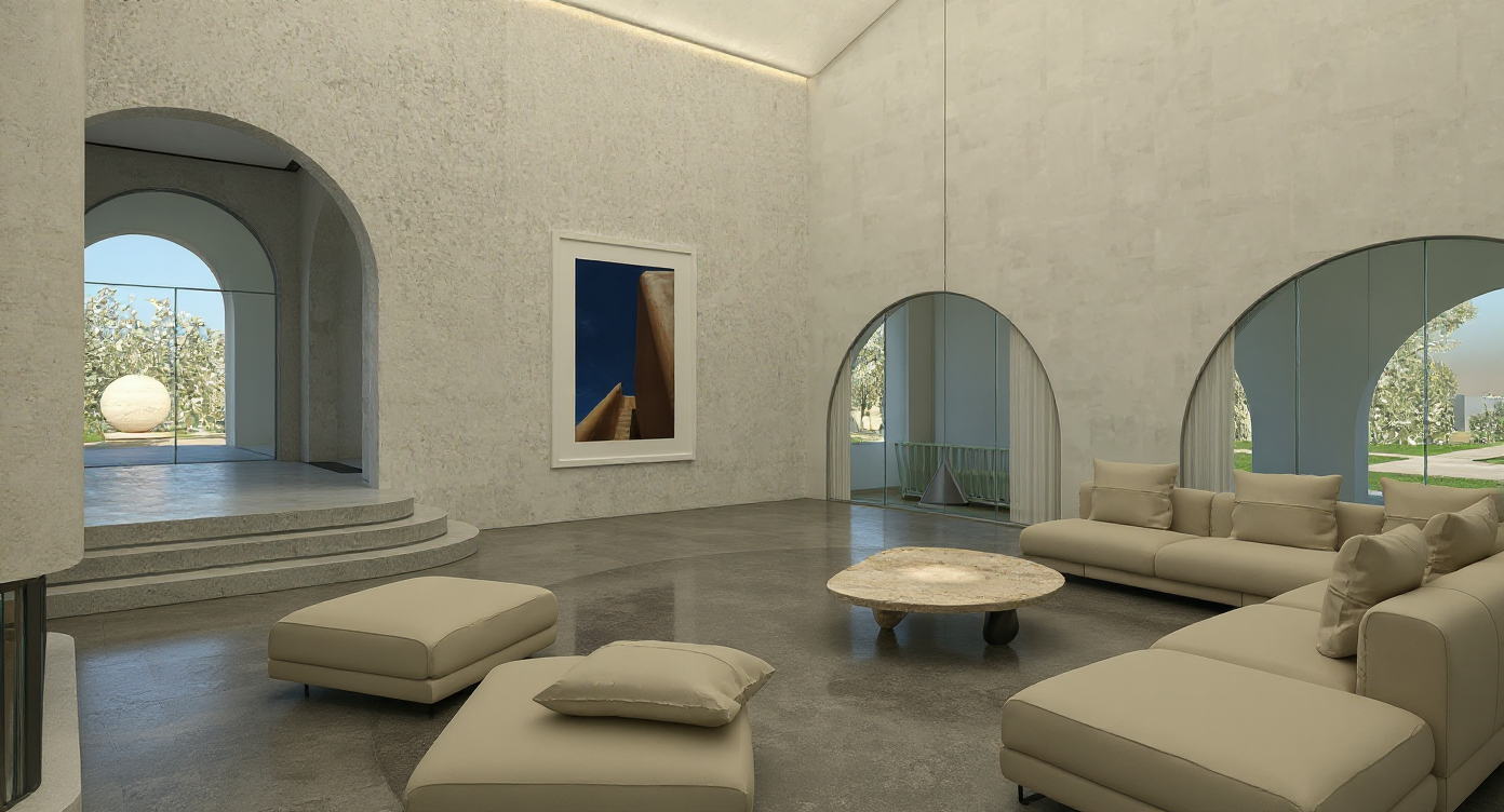 residential design minimalistic contemporary approach garden view from the terrace with wooden ceiling exterior sofas taupe color large exterior table with andreu world exterior chairs in dark taupe color set of sun beds with sunbrella gandia blasco and large swimming pool indirect lighting at night
