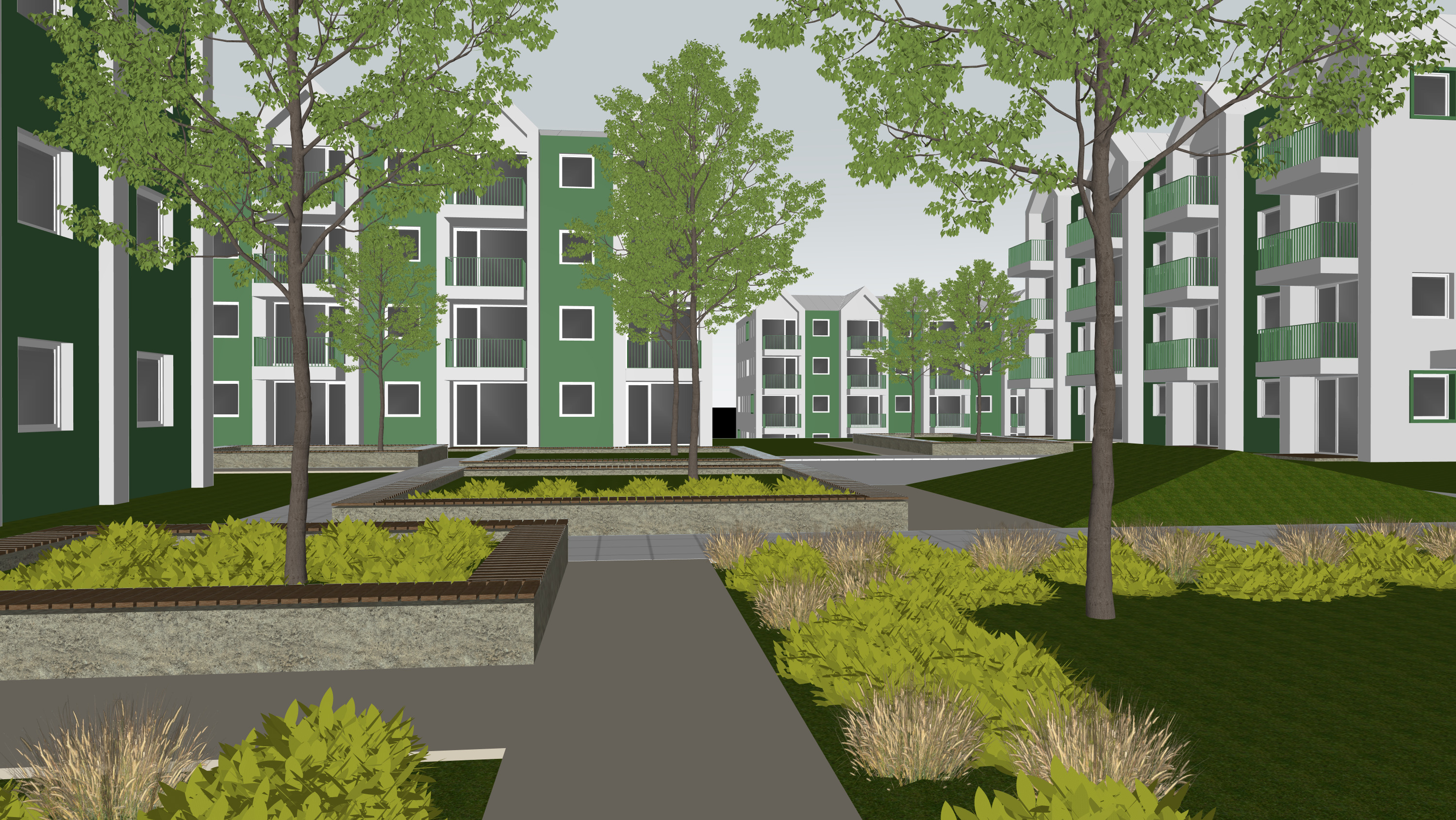 create a stunning realistic architectural rendering of a modern apartment complex the buildings should be mid rise with sleek minimalist design featuring a deep forest green exterior contrasted with crisp white accents the windows and balcony railings are a muted dark gray providing a contemporary touch the rooftops are pitched and finished in a light gray metallic sheen the landscape is lush and meticulously maintained with vivid green grass covering the ground include rich golden ornamental grasses in the foreground adding texture and depth the pathways are smooth with a warm neutral gray tone the atmosphere is tranquil and inviting captured during a clear late afternoon with soft natural lighting the sky is a gentle gradient from pale blue to light gray near the horizon conveying a sense of calm and serenity