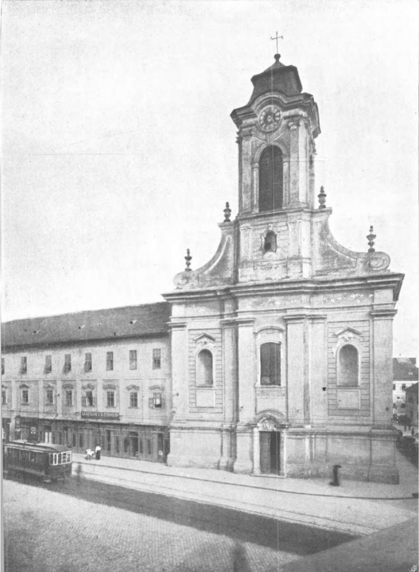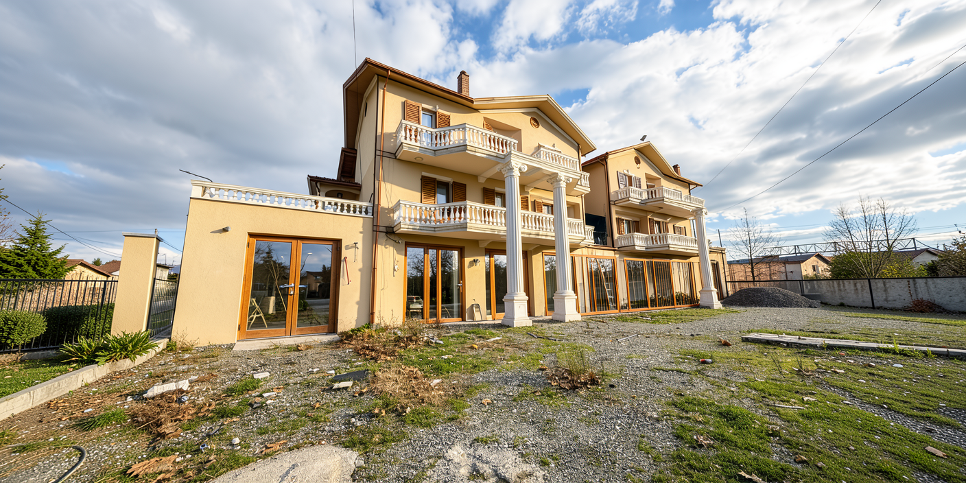 remove text from top of the picture stucco facade nice beautyfull clouds sunny day flatland in the background old boxy tram on the track in the dimension of the reference pcture tram track is on an old paved surface