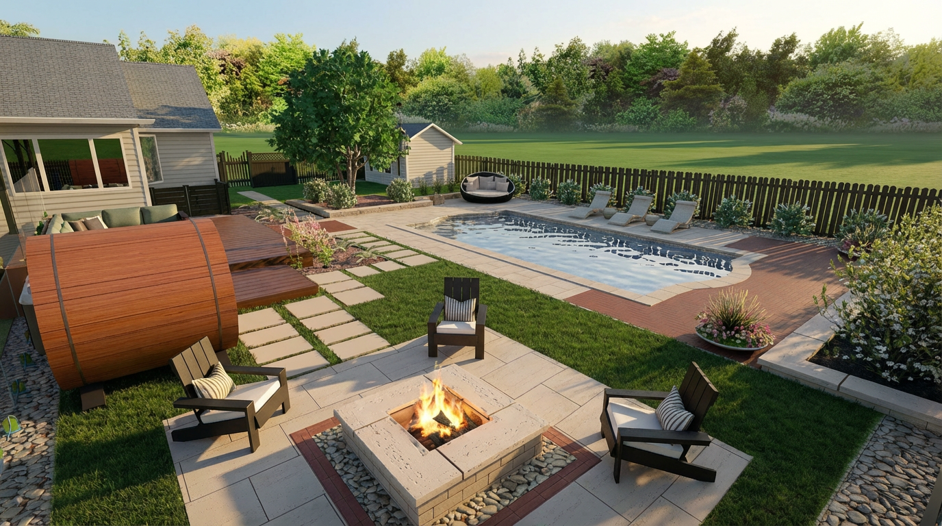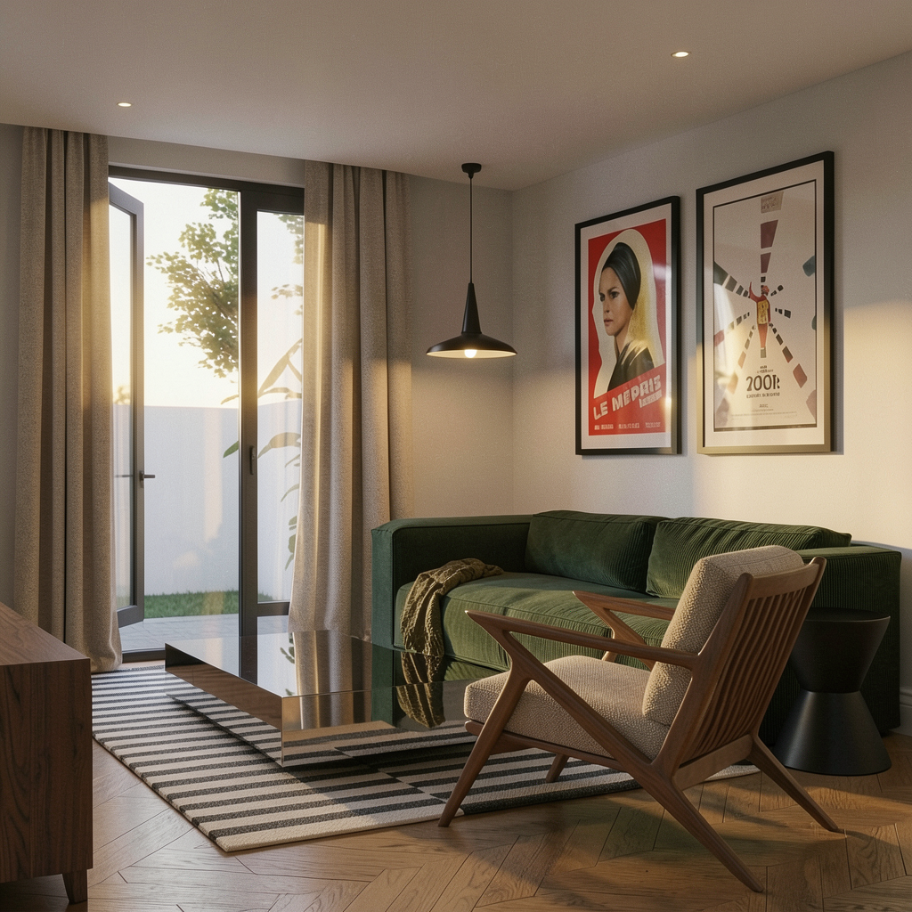editorial hyperrealistic interior living room scene based on the existing composition camera angle and warm sunset lighting maintain all original materials textures and atmosphere enhance the scene with subtle realistic lived in details while preserving the overall design integrity on the mirrored coffee table add a single ceramic coffee cup with carefully realistic proportions not oversized filled with coffee natural placement slightly off center editorial composition on the sofa only two cushions placed on the end closest to the pendant lamp one 50x50 cm cushion with desaturated burgundy and off white stripes one smaller plain cushion in the same off white tone placed in front of the striped one behind the sofa on the side closer to the window add a single woven basket with blankets inside the basket should only slightly emerge from behind the sofa partially visible it must not extend beyond the sofa edge just enough to suggest space between sofa and wall on the floor replace flooring with rectangular wooden planks in the same tone plank direction parallel to the window rug maintain the same design ikea stockholm style edges must be standard and subtle not thick or exaggerated exterior scene through the window maintain private garden white wall and tree add a clearly defined man outside visible from the back he is wearing red shorts and a white t shirt he is talking on the phone his figure must be sharp and well defined with readable posture and body details preserve hyperrealistic materiality corduroy sofa texture walnut wood grain beige upholstery curtain fabric glass reflections and lighting behavior cinematic poetic editorial interior photography style ultra realistic rendering soft depth of field subtle film grain natural imperfections