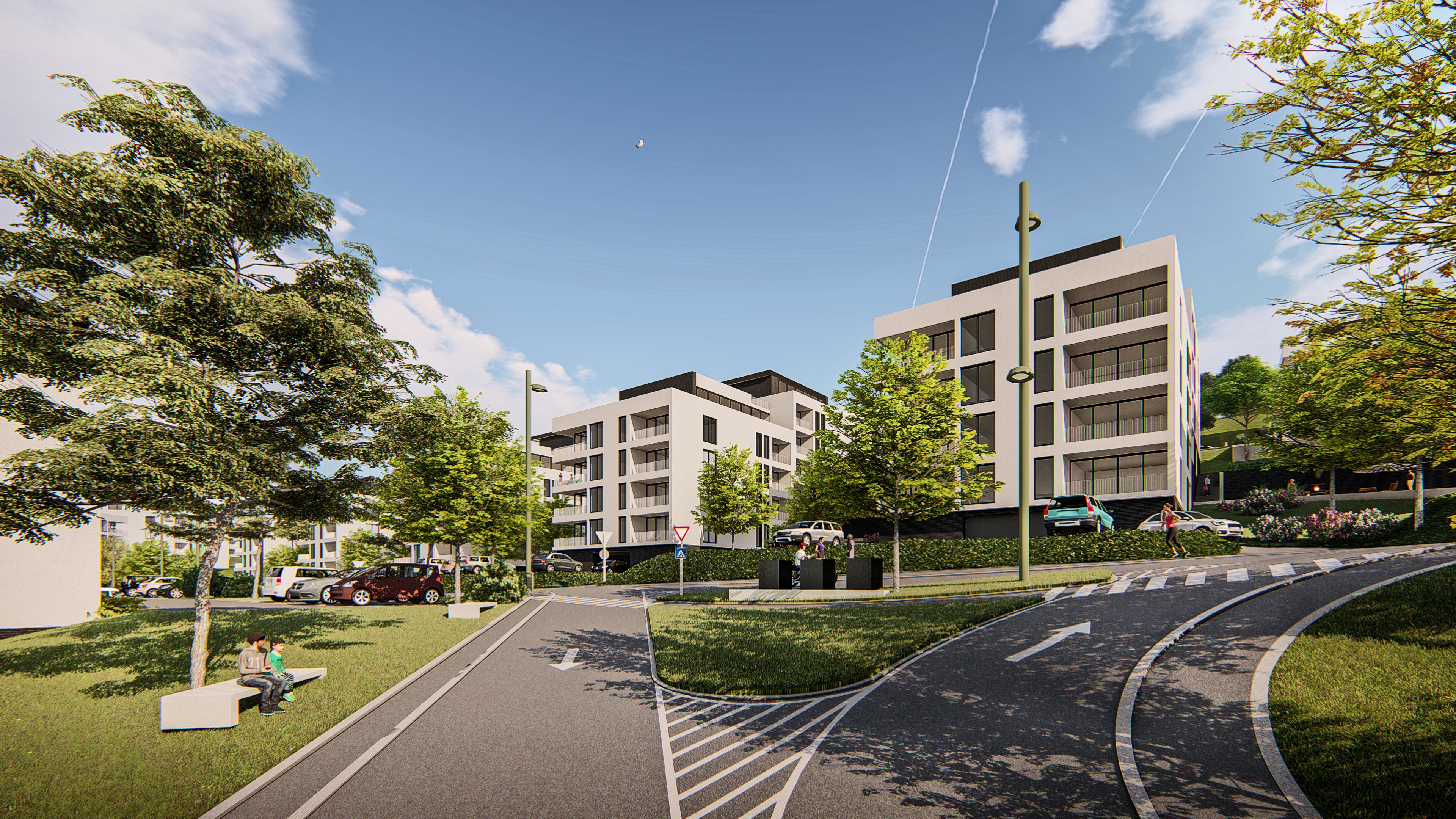 important preserve the existing geometry and the existing context exactly as provided do not modify alter reinterpret add remove scale or reshape any geometry do not change the site surroundings street layout neighboring buildings vegetation or context elements do not modify geometry scale proportions buildings road layout sidewalks or surrounding context in any way do not change text photorealistic architectural rendering clean and balanced contrast calm cinematic mood style contemporary european residential architecture minimalist premium understated include people subtle motion blur for realism keep the green roof do not add people