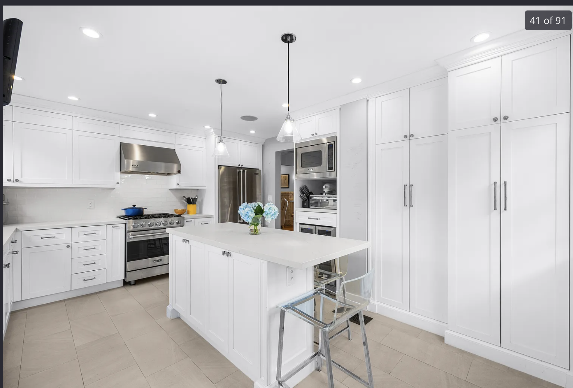 create a hyper realistic render of this kitchen remodel change the cabinetry to light wood with polished brass knobs hide the microwave and oven and change the kitchen for a la cornue black stove change the backsplash and kitchen island for calcatta viola and change the floor for a checkered green and white marble change the recessed light for warm light and use matilda goads flora brass lamp for the pendants above the kitchen island add a tropical orchid arrangement use the same floor plan as the original picture
