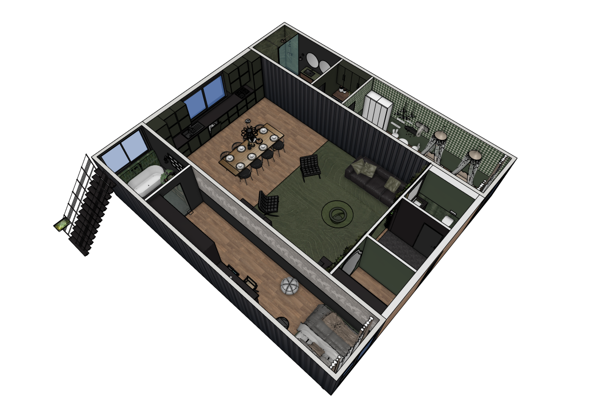 convert this floor plan into a realistic isometric 3d view of a full house show the space from an elevated angle with furniture walls and details visible the floor in the bedroom is the same as the living room the chairs are black and the couch is black leather in the entrance the floor is black tile and the wall behind the toilet is the same green as the wall of the kids bedroom same for the kitchen where there s the vanity with two round mirror the wall is black use the same furniture as shows on the plan do not change the orientation of the floorplan