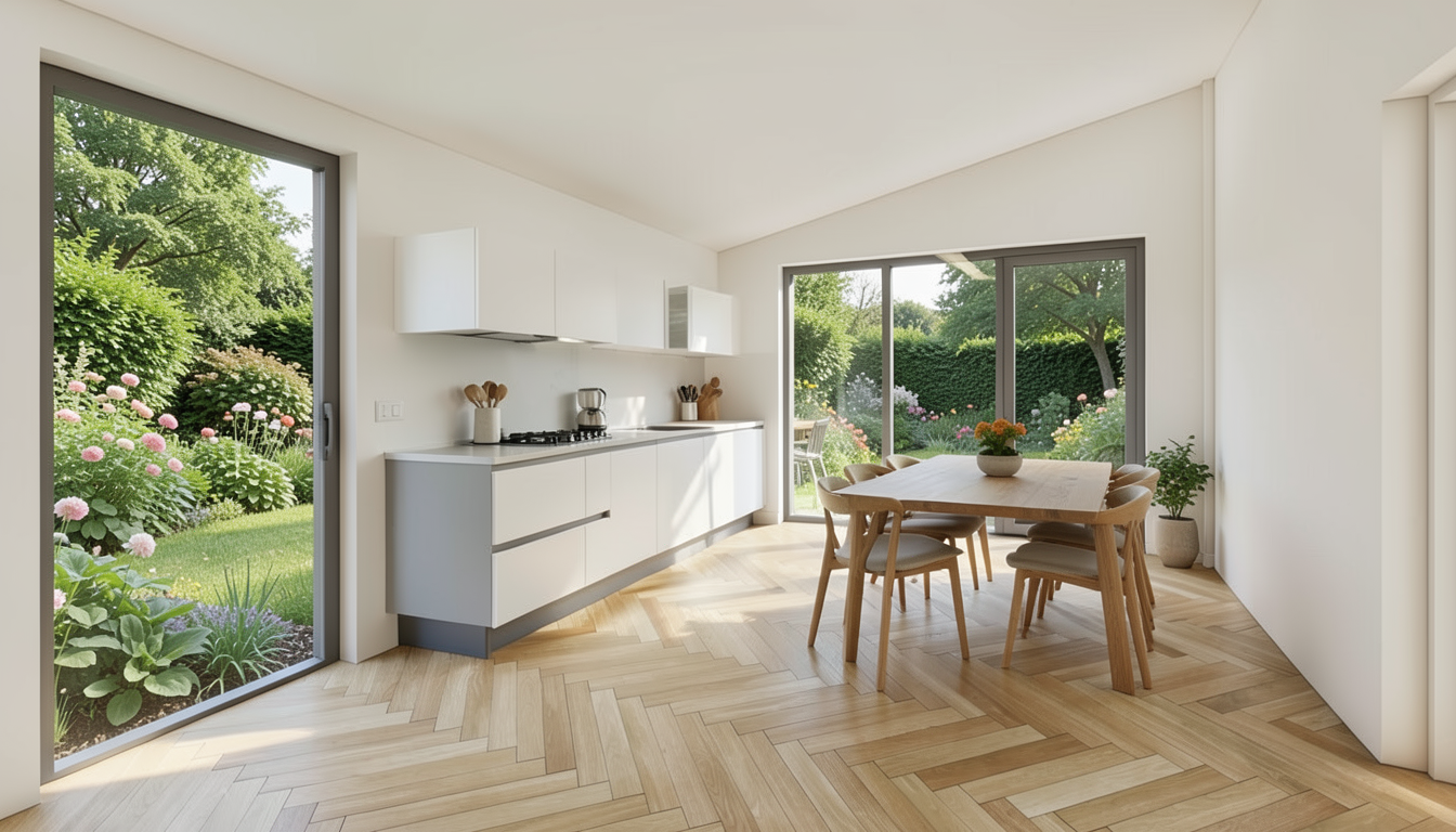 links een keukenblok modern kleur wit plint keukenblok grijs geen bovenkasten deze is niet in de muur ingebouwd maar staat dus tegen de muur aan ook een moderne strakke eettafel toevoegen met boven een hanglamp uitzicht op veel groen met bomen geen schutting buiten