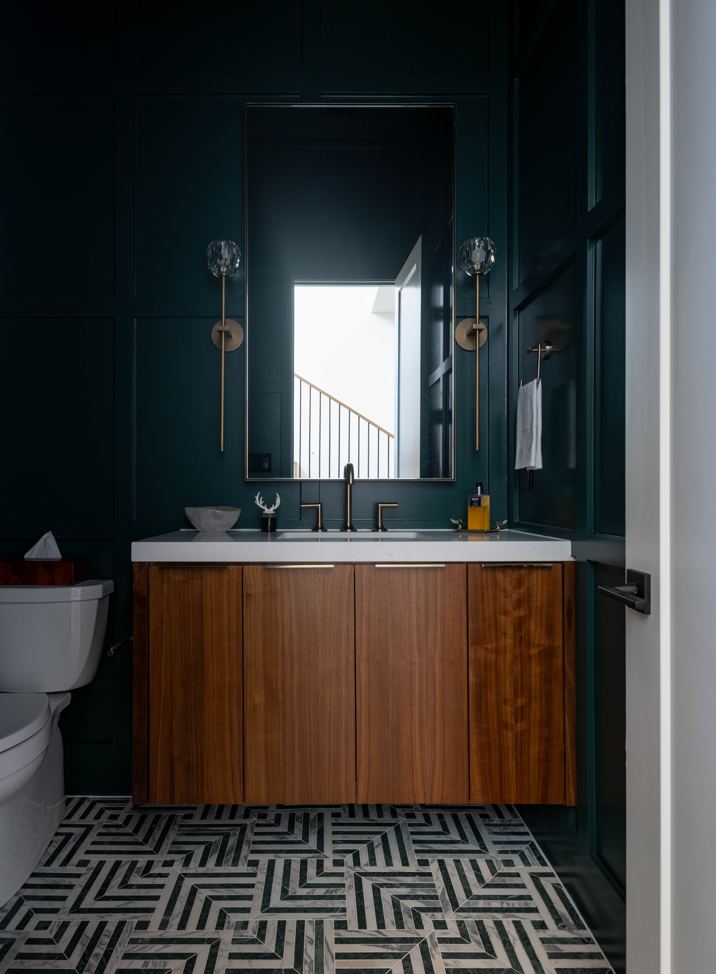 remove wall sconces and change walls and cabinets to white paint change nothing else