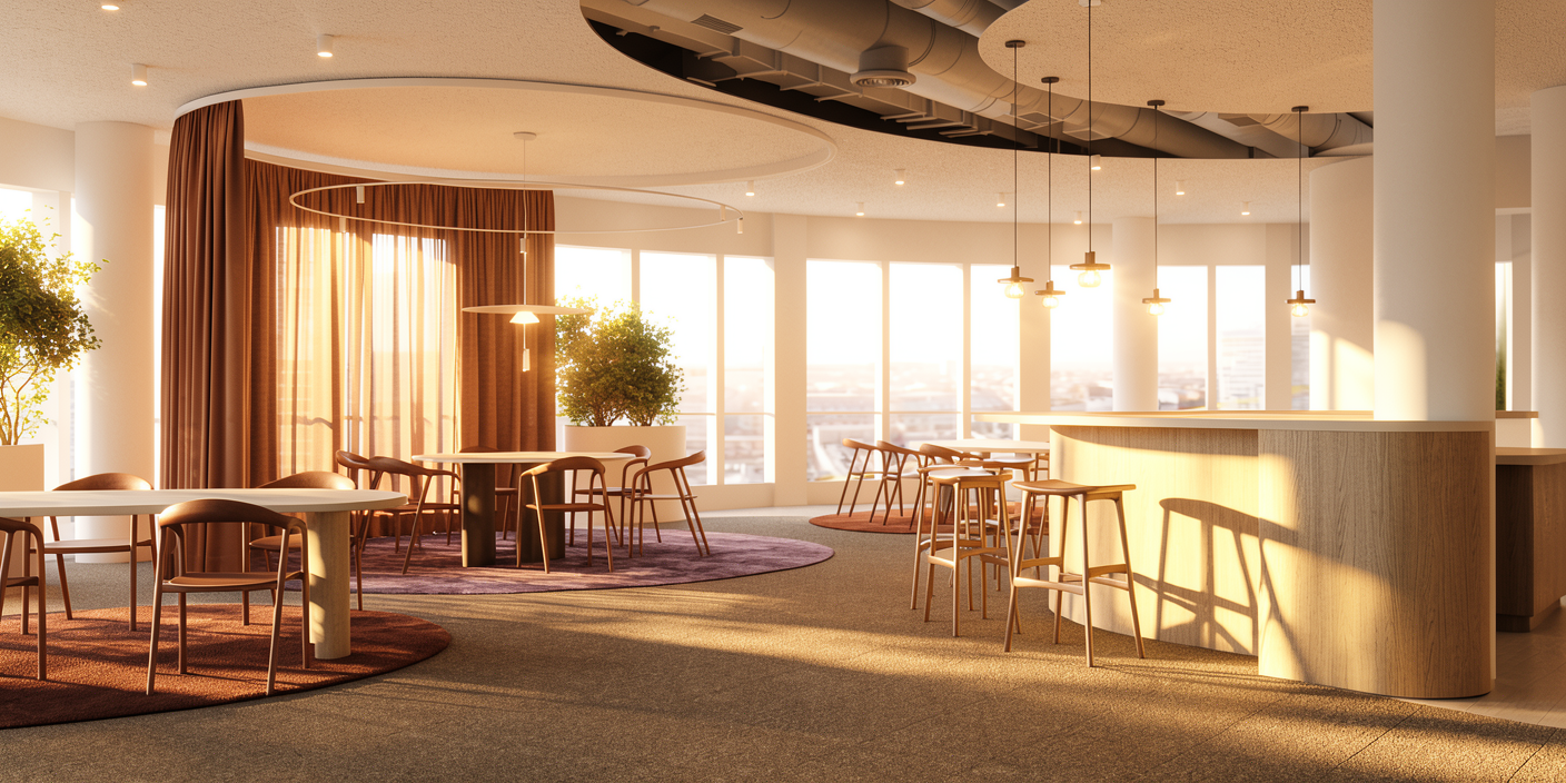 don t change anything of the architecture or laoyout change the colour of the purple rug into the red rug same colour and texture as the red rug change the light timing around 1pm a bit less golden hour