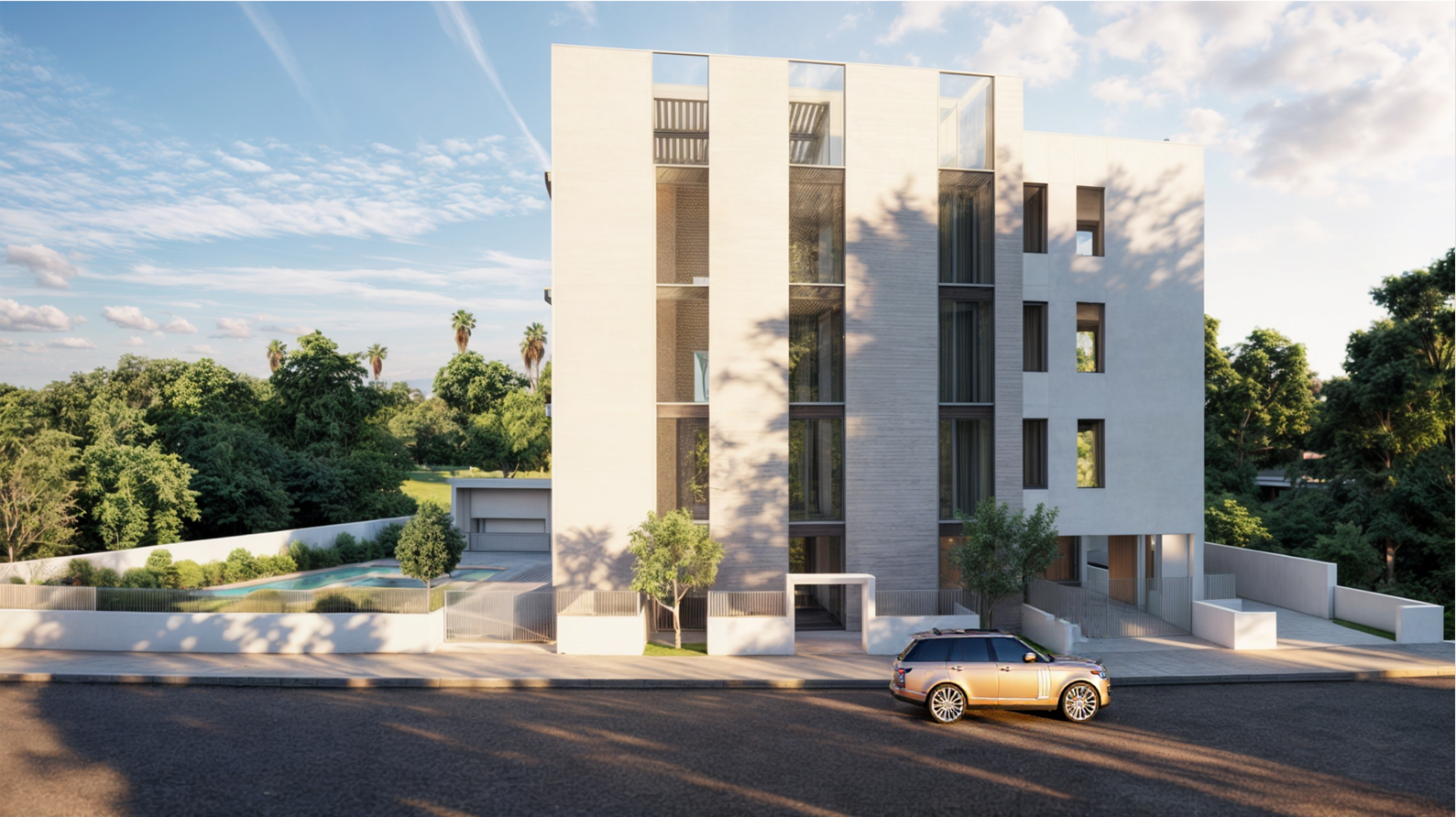 scene use the uploaded base model as the geometry and recreate it in a clean bright high end architectural visualization keep the building proportions balconies pool area bbq pavilion and fences identical to the base model follow the moodboard style for materials landscape and realism lighting bright clear daytime lighting with no sun visible in the frame soft even illumination across the entire scene no harsh long shadows no deep shadows no strong directional contrast remove all dark shadows on the foreground road building fa ade pool area and inner courtyard the lighting should feel like a bright mediterranean midday with a clean sky and diffused sunlight architecture pools and balconies should be evenly lit sunlight direction should be subtle and soft coming from outside the frame illuminating the balconies and pool without creating strong shadow edges sky must be clean bright and cloudless architecture replace all placeholder fa ade materials with realistic ones main exterior modern light beige stone cladding with soft horizontal texture limestone light sandstone travertine warm undertones matte seamless secondary white surfaces smooth clean white plaster balcony ceilings warm natural wood panels balcony railings transparent glass with realistic reflections window frames slim dark aluminum materials stone texture subtle and elegant no heavy patterning glass must reflect the bright sky softly wood must be warm and matte pool water clear bright blue with mild specular highlights landscape replace all empty terrain with organised maintained landscaping add trimmed green grass in the background add a small number of mediterranean city trees olive type or ficus type add neat shrubs along the pool and fence line no wild vegetation no dry bushes ground road add realistic light or medium gray asphalt road in front of the building keep the pavement clean with soft ambient light objects optional one modern car bmw on the road no people style photorealistic bright clean mediterranean residential architecture high end v ray corona style soft even daylight no dramatic shadows no sunset feeling restrictions do not change the building geometry do not change pool layout pavilion fence shape do not change the camera angle only improve materials landscape and lighting as described