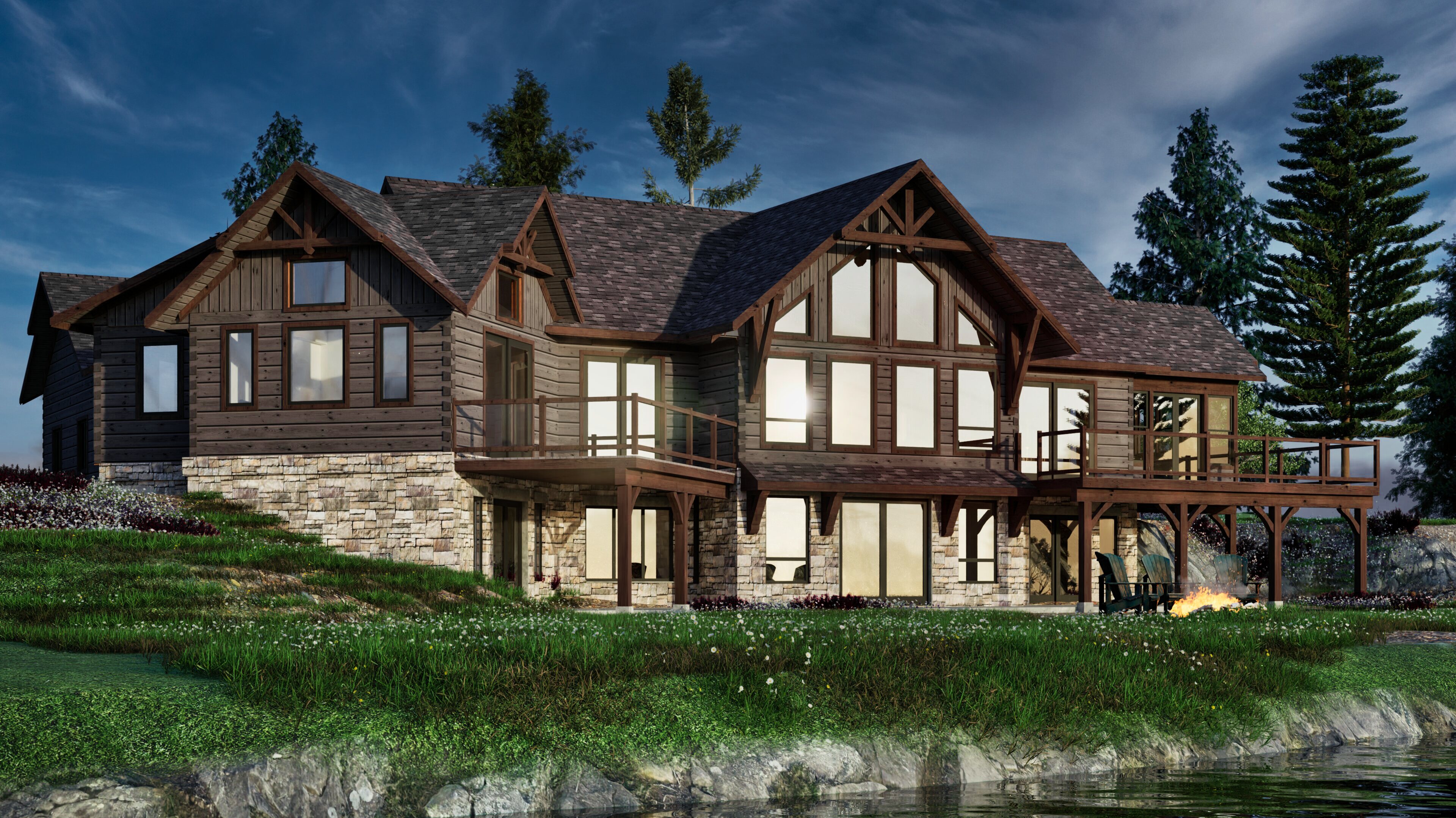 make this render look realsitic add some trees found in ontario in the background plance this building on a farmland not a lake front
