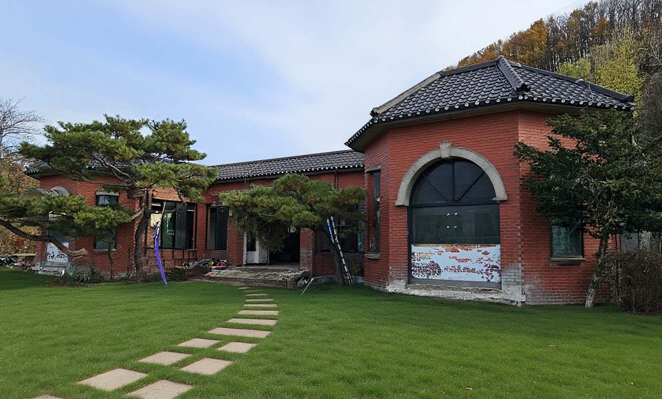 maintaining the shape of the building modern style industrial black frame canopy concrete keep the canopy column wall finishing black wood and plywood remove the arch the window is a fixed window frame the front garden has grass and stepping stones it s like a calm china restaurant