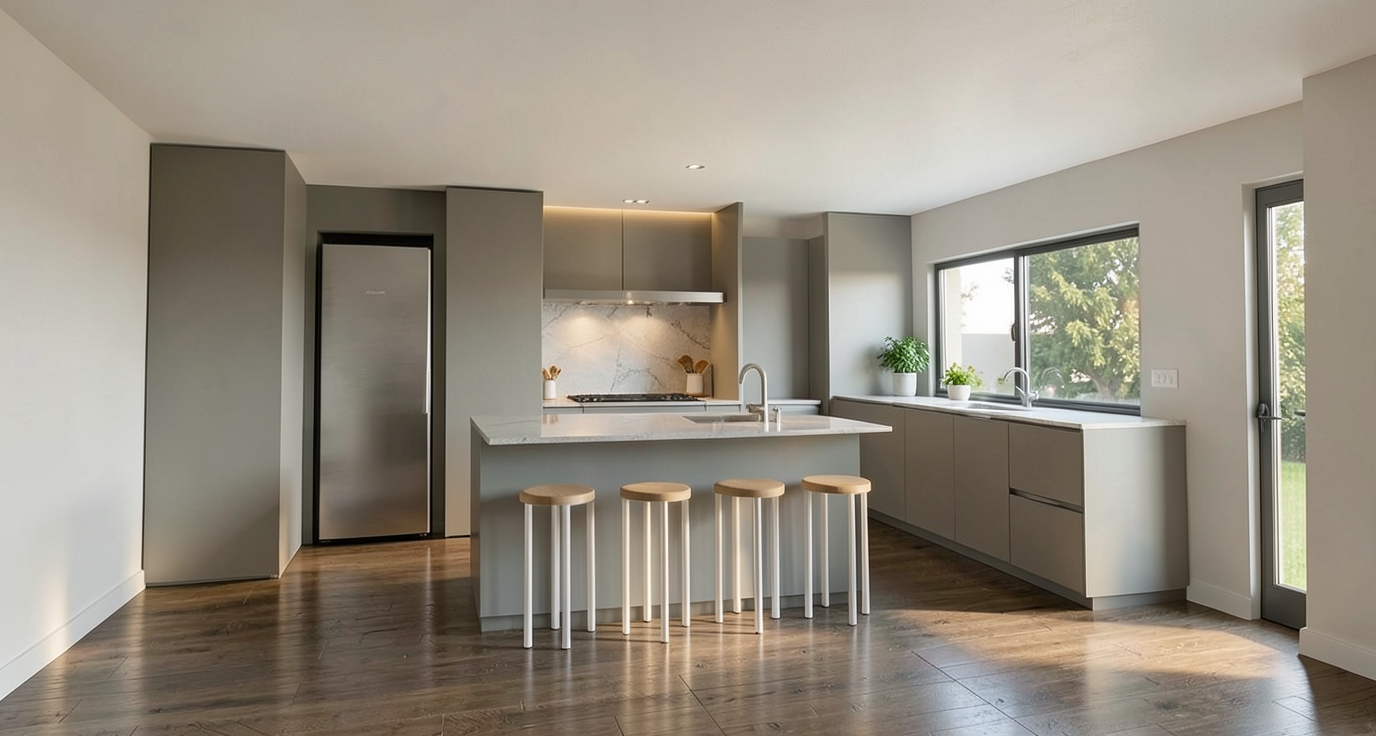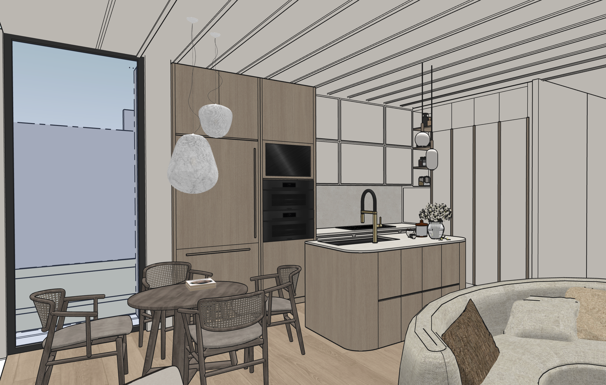 turn this image into a realistic photograph keep the indoor details and shooting angle in the image unchanged restore material details modern interior space design realistic surface reflections authentic indoor texture scattered light soft cinematic lighting bright space light wood colour and warm white natural tone