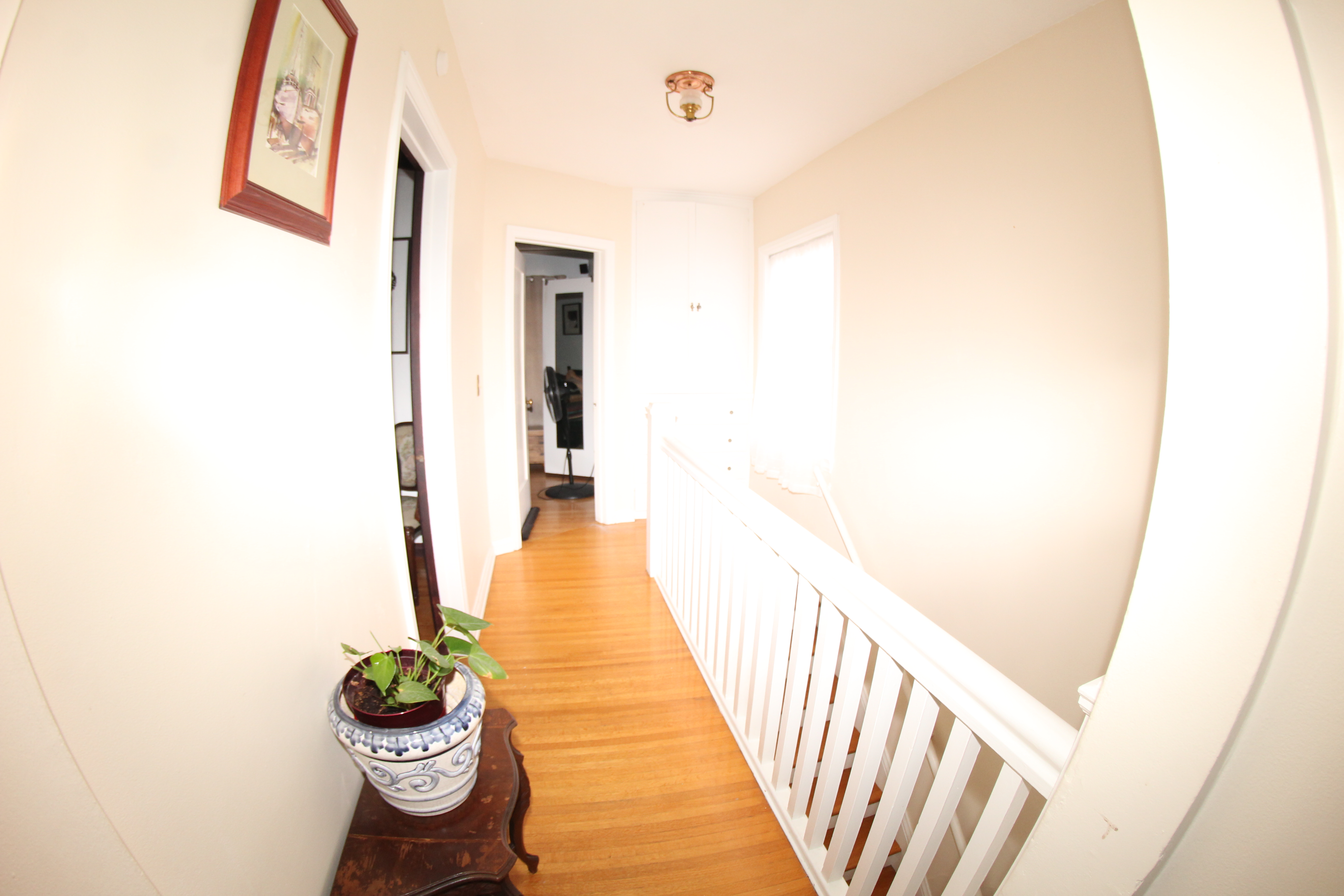 add multiple pictures and frames to the right wall make right wall a beige color replace light fixture replace potted plant