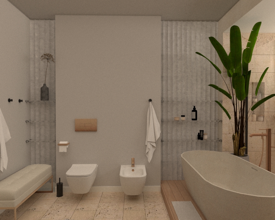 make a modern and realistic interior visualisation save details improve textures and light make architectural concrete texture on walls the floor and wall on the right side is made of soft travertine